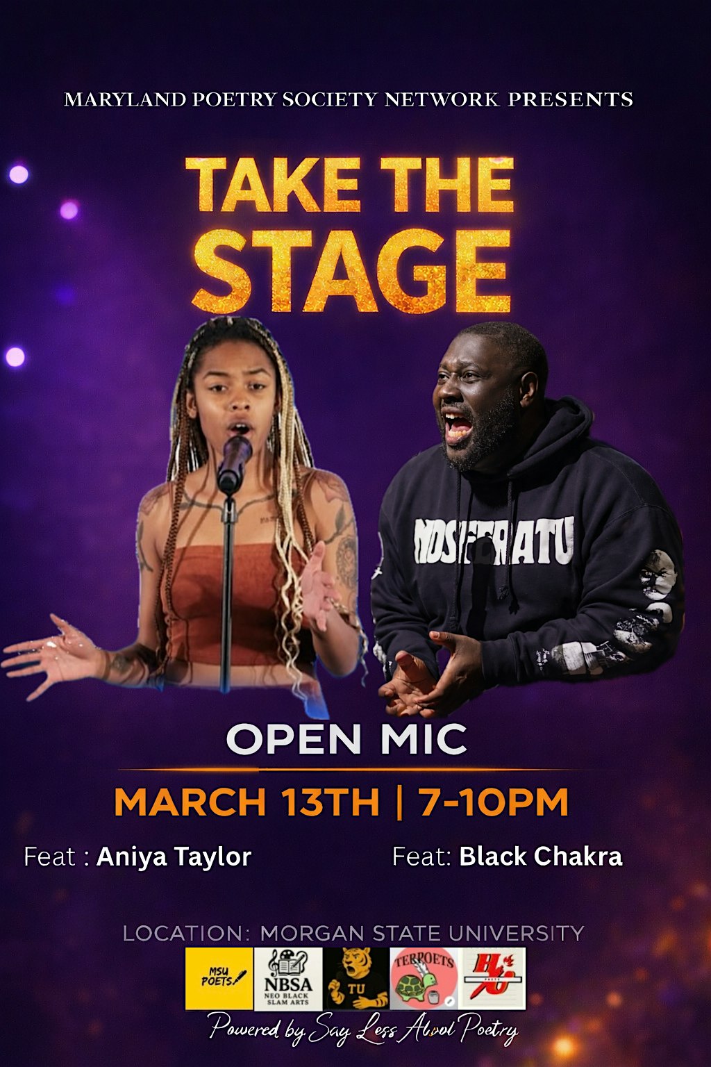 by admin05Mar Take The Stage – Open Mic at Morgan State University – Baltimore, MD Take The Stage – Open Mic at Morgan State University – Baltimore, MD 2 2 people viewed this event. Maryland Poetry Society Network hosts the first all-inclusive university open mic at Morgan State, uniting Morgan, Towson, Coppin, UMD & HU Tickets-RSVP Link Date And Time Friday, March 13th, 2026 07:00 PM (PST) Venue Morgan State University Location 1700 East Cold Spring Lane, Baltimore, MD 21251 Event Types Party or Social GatheringPerforming & Visual Arts Event Category BaltimoreMaryland Share With Friends Facebook Twitter Linkedin Xing Pinterest Share This Post: