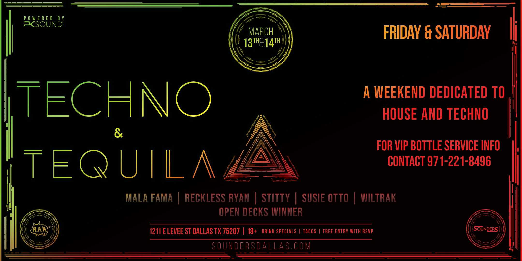 by admin23Feb Techno & Tequila 3/13 & 3/14 – Dallas, TX at Sounders – Dallas, TX Techno & Tequila 3/13 & 3/14 – Dallas, TX at Sounders – Dallas, TX 1 1 people viewed this event. Playing your favorite house and techno songs on Dallas’ BEST sound system at Sounders ALL WEEKEND LONG! Tickets-RSVP Link Date And Time Friday, March 13th, 2026 09:00 PM (PST) Venue Sounders Location 1211 East Levee Street, Dallas, TX 75207 Event Types Concert or PerformanceMusic Event Category DallasTexas Share With Friends Facebook Twitter Linkedin Xing Pinterest Share This Post: