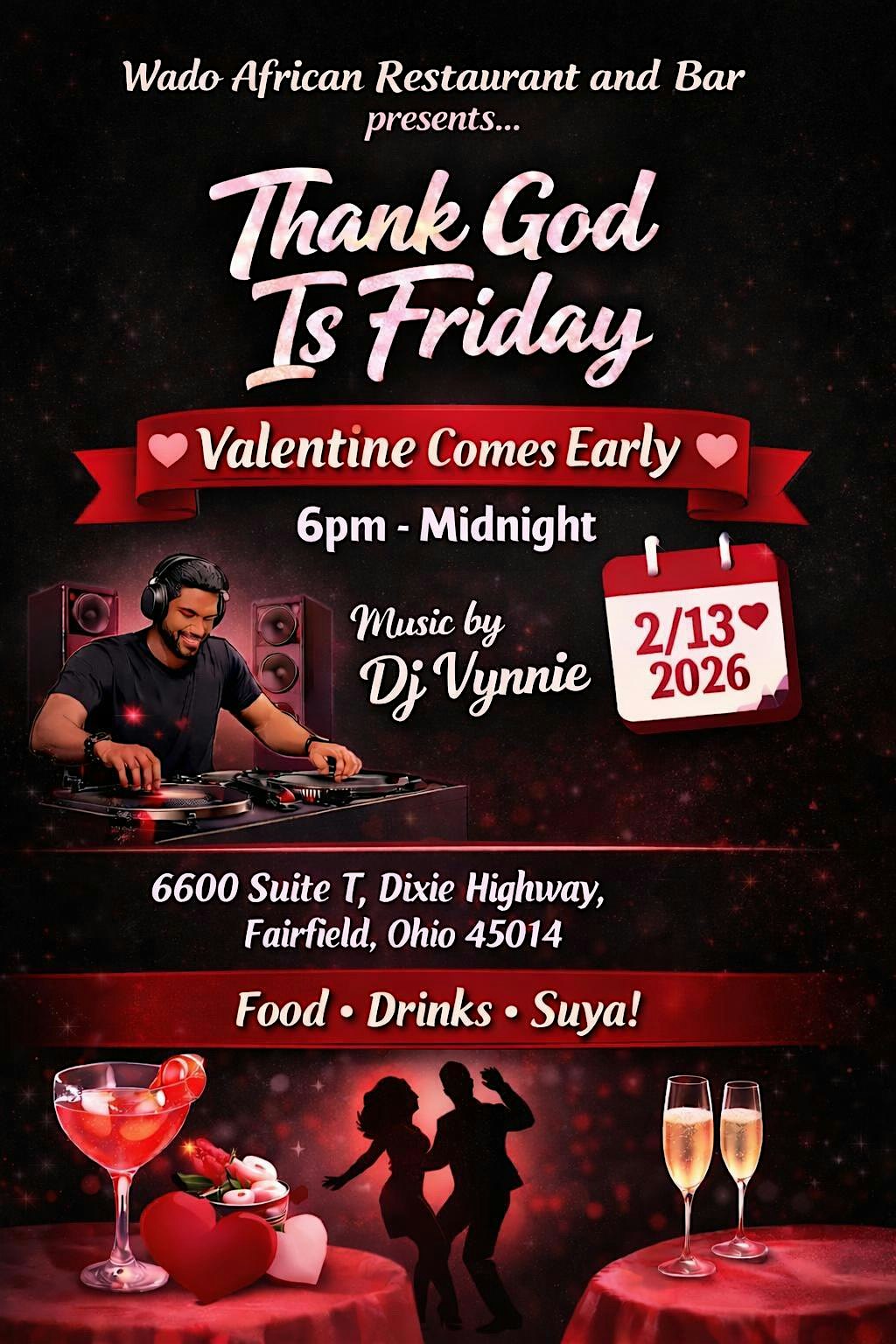 by admin13Feb THANK GOD IS FRIDAY(VALENTINE COMES EARLY) at Wado African Restaurant and Bar – Fairfield, OH THANK GOD IS FRIDAY(VALENTINE COMES EARLY) at Wado African Restaurant and Bar – Fairfield, OH 2 2 people viewed this event. Get ready to kick off your weekend early with a Valentine’s twist at the Thank God Is Friday event! Tickets-RSVP Link Date And Time Friday, March 13th, 2026 10:00 PM (PST) Venue Wado African Restaurant and Bar Location 6600 T Dixie Highway, Fairfield, OH 45014 Event Types Party or Social GatheringSeasonal & Holiday Event Category Ohio Share With Friends Facebook Twitter Linkedin Xing Pinterest Share This Post: