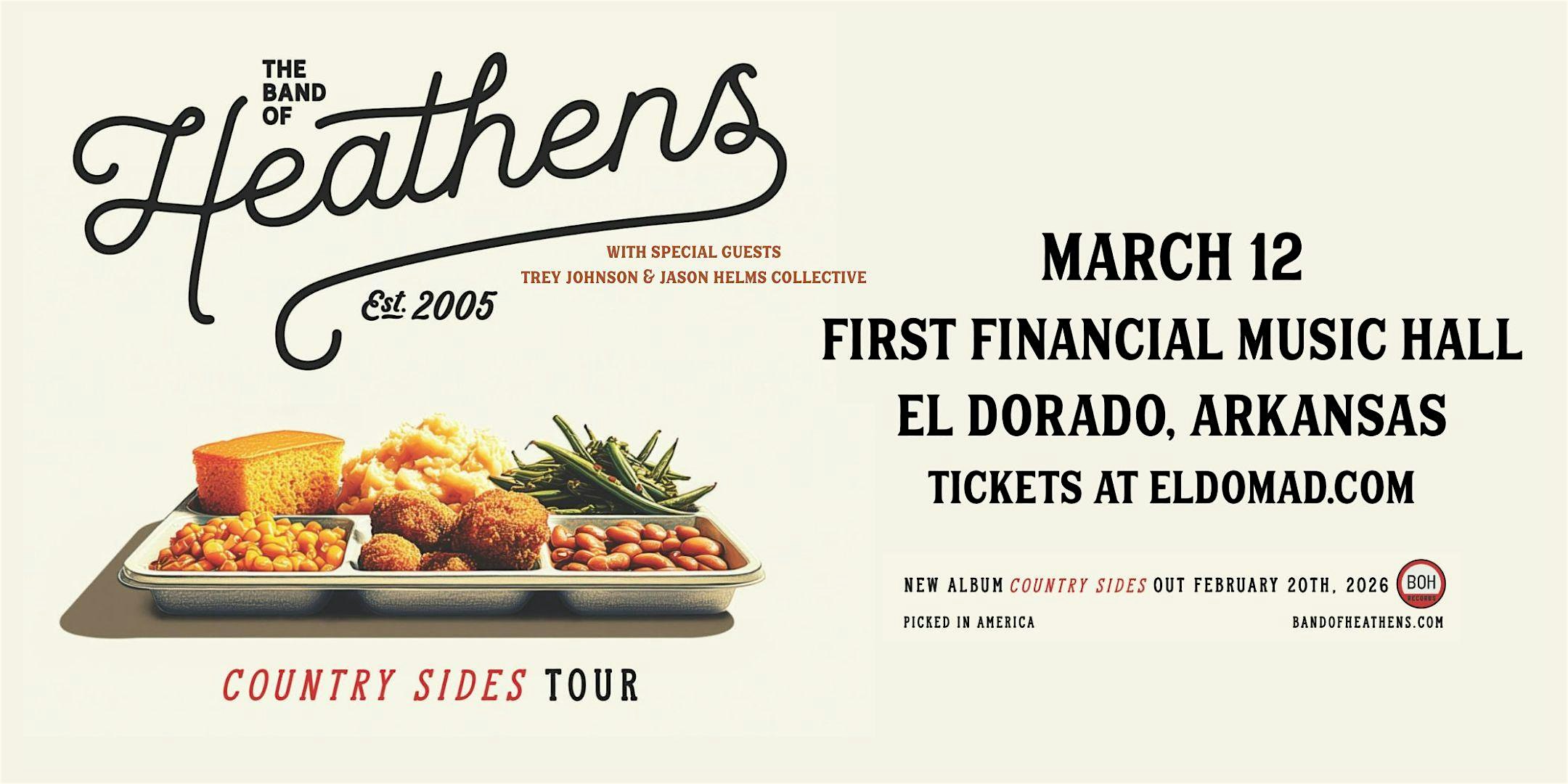 by admin13Feb The Band of Heathens at First Financial Music Hall – El Dorado, AR The Band of Heathens at First Financial Music Hall – El Dorado, AR 2 2 people viewed this event. Get ready to rock out with The Band of Heathens with special guest Trey Johnson & Jason Helms – it’s gonna be a night to remember! Tickets-RSVP Link Date And Time Friday, March 13th, 2026 12:00 AM (PST) Venue First Financial Music Hall Location 101 East Locust Street, El Dorado, AR 71730 Event Types Concert or PerformanceMusic Event Category Arkansas Share With Friends Facebook Twitter Linkedin Xing Pinterest Share This Post: