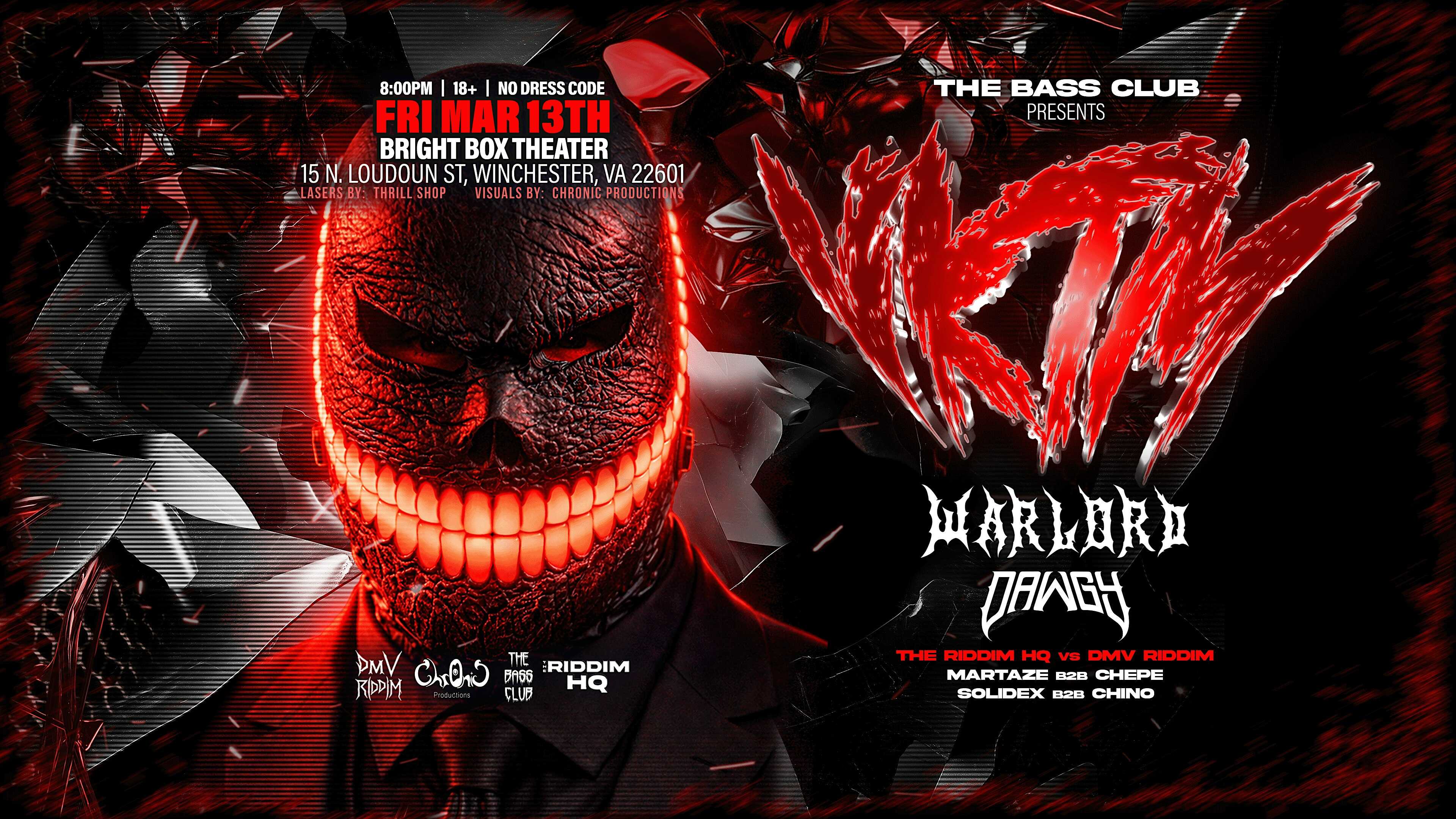 by admin23Feb THE BASS CLUB PRESENTS: VKTM at Bright Box Theater – Winchester, VA THE BASS CLUB PRESENTS: VKTM at Bright Box Theater – Winchester, VA 1 1 people viewed this event. Get ready for an all out Riddim War with VKTM + WARLORD! Event is 18+. Advance tickets are strongly recommended. Tickets-RSVP Link Date And Time Friday, March 13th, 2026 08:00 PM (PST) Venue Bright Box Theater Location 15 North Loudoun Street, Winchester, VA 22601 Event Types Concert or PerformanceMusic Event Category Virginia Share With Friends Facebook Twitter Linkedin Xing Pinterest Share This Post: