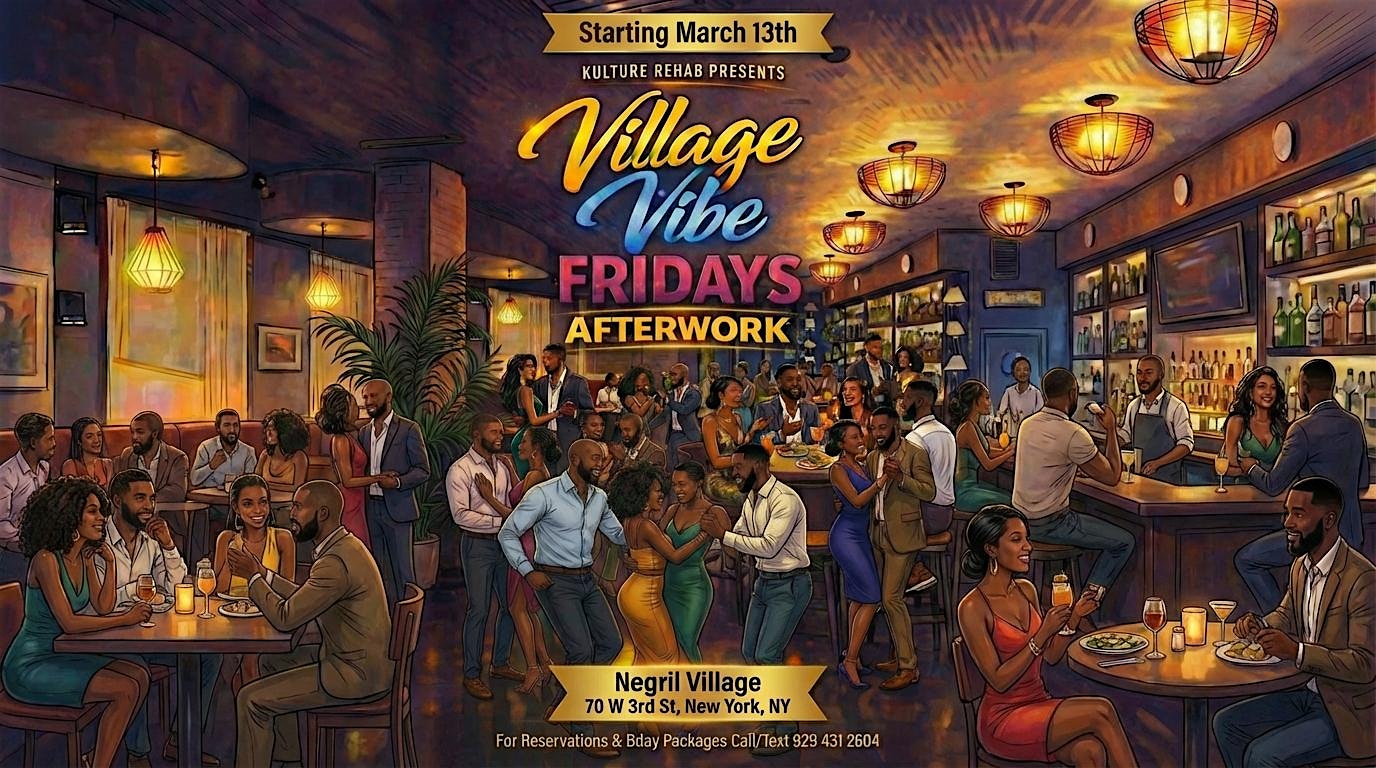 by admin05Mar Village Vibe Fridays AfterWork at Negril Village – New York, NY Village Vibe Fridays AfterWork at Negril Village – New York, NY 1 1 people viewed this event. Village Vibes Afterwork returns March 13th—NYC’s finest DJs, Afro-Caribbean vibes, drink & appetizer specials . Free w/rsvp b4 10pm Tickets-RSVP Link Date And Time Friday, March 13th, 2026 06:00 PM (PST) Venue Negril Village Location 70 West 3rd Street, New York, NY 10012 Event Types Community & CultureParty or Social Gathering Event Category New YorkNew York City Share With Friends Facebook Twitter Linkedin Xing Pinterest Share This Post: