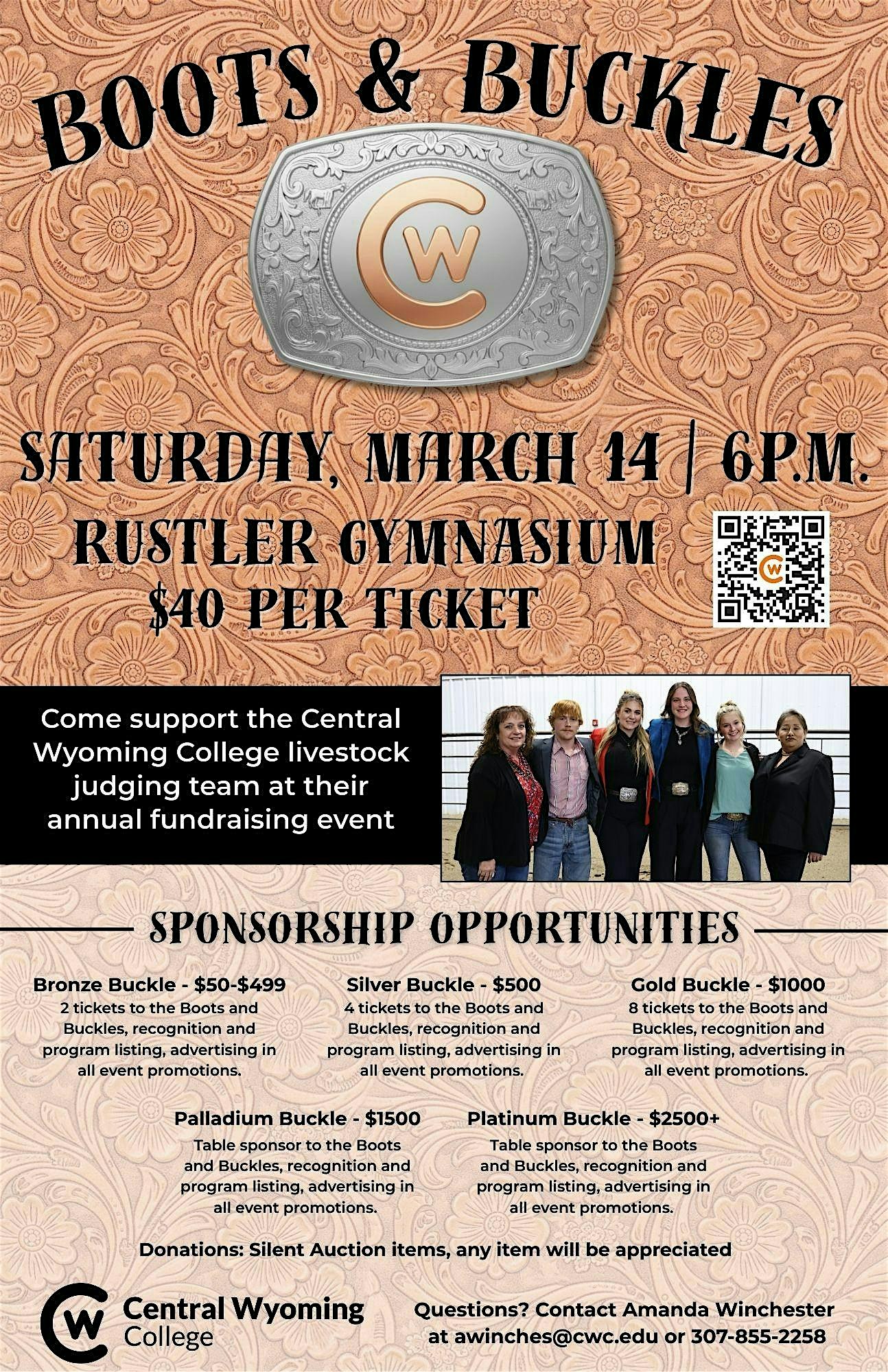 by admin24Feb 2026 Boots & Buckles at 1010 Fairgrounds Dr – Riverton, WY 2026 Boots & Buckles at 1010 Fairgrounds Dr – Riverton, WY 2 2 people viewed this event. Boots & Buckles: CWC’s annual Livestock Judging fundraiser supporting students, tradition, and community. Tickets-RSVP Link Date And Time Saturday, March 14th, 2026 06:00 PM (PST) Venue 1010 Fairgrounds Dr Location 1010 Fairgrounds Drive, Riverton, WY 82501 Event Types Food & Drink Event Category Wyoming Share With Friends Facebook Twitter Linkedin Xing Pinterest Share This Post: