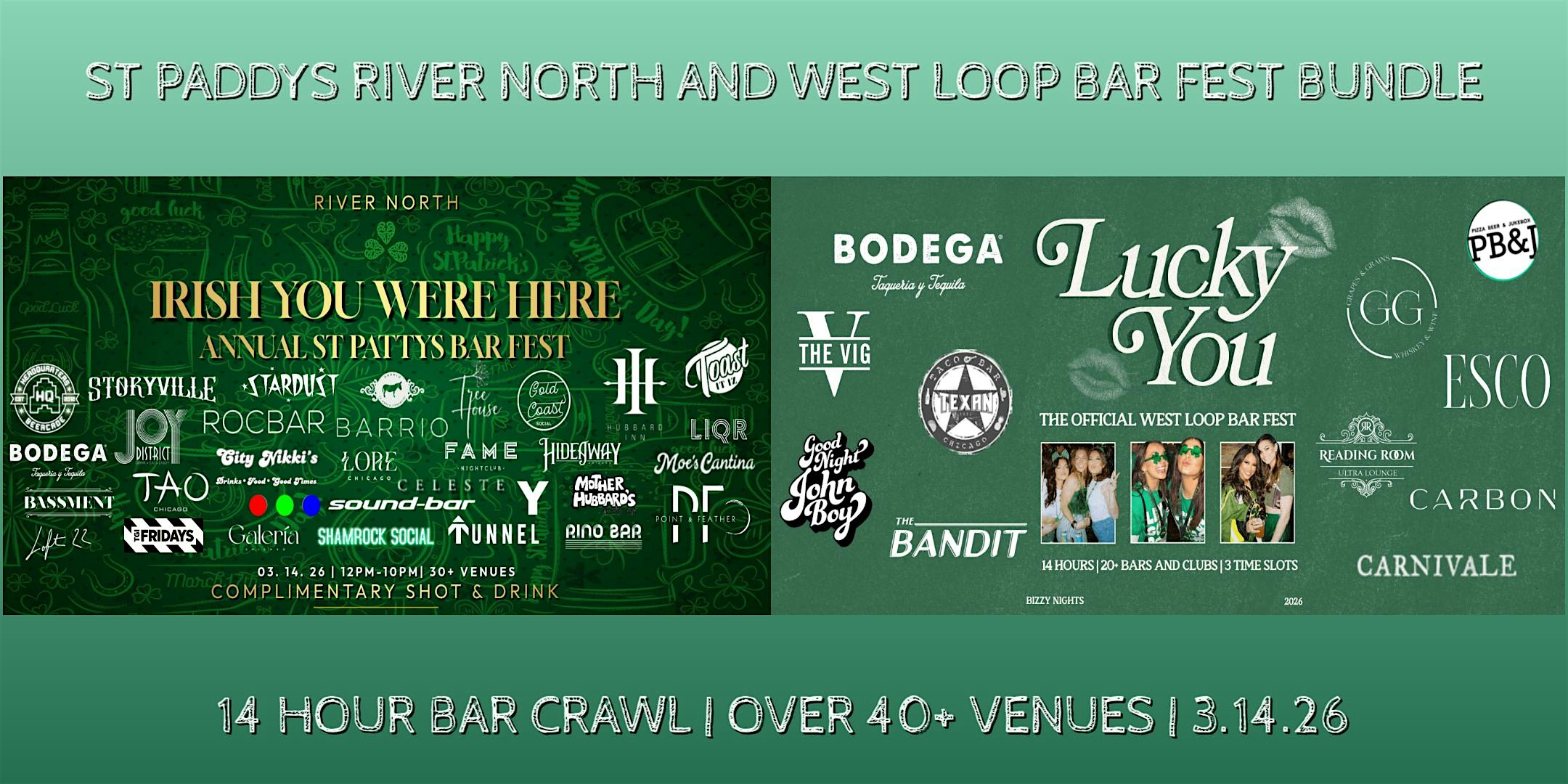 by admin27Feb ANNUAL ST PATTYS RIVER NORTH AND WEST LOOP BAR FEST at 222 W Ontario St – Chicago, IL ANNUAL ST PATTYS RIVER NORTH AND WEST LOOP BAR FEST at 222 W Ontario St – Chicago, IL 1 1 people viewed this event. Be lucky and celebrate St Patty’s at the best nightclubs and bars in River north and West loop! DRINKS,SHOTS, SPECIALS ALL INCLUDED!!! Tickets-RSVP Link Date And Time Saturday, March 14th, 2026 08:00 AM (PST) Venue 222 W Ontario St Location 222 West Ontario Street, Chicago, IL 60654 Event Types Food & DrinkParty or Social Gathering Event Category ChicagoIllinois Share With Friends Facebook Twitter Linkedin Xing Pinterest Share This Post: