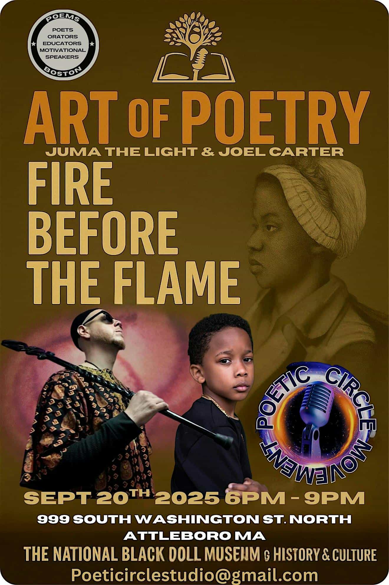 by admin14Feb ART OF POETRY at National Black Doll Museum of History & Culture – North Attleborough, MA ART OF POETRY at National Black Doll Museum of History & Culture – North Attleborough, MA 1 1 people viewed this event. ART OF POETRY is a showcase of artist and poets. We celebrate and support artist & poets monthly every second saturday, 5pm – 9pm Tickets-RSVP Link Date And Time Saturday, March 14th, 2026 10:00 PM (PST) Venue National Black Doll Museum of History & Culture Location 999 South Washington Street, North Attleborough, MA 2760 Event Types Concert or PerformancePerforming & Visual Arts Event Category Massachusetts Share With Friends Facebook Twitter Linkedin Xing Pinterest Share This Post: