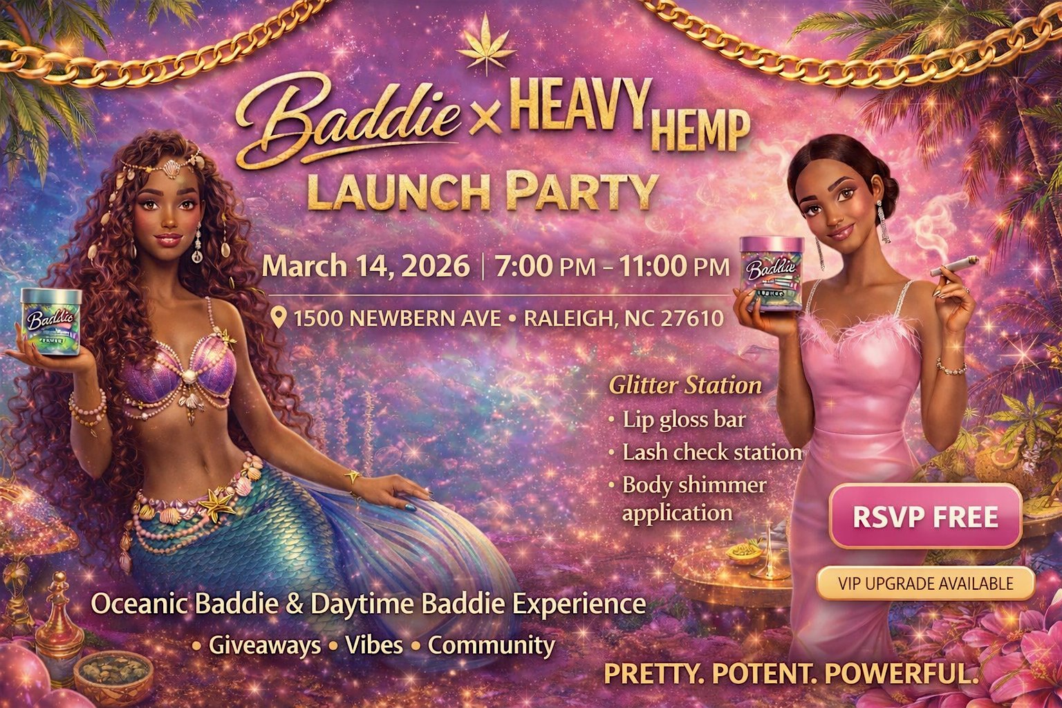 by admin24Feb Baddie x Heavy Hemp Launch Party — Pretty. Potent. Powerful. at 1500 New Bern Ave – Raleigh, NC Baddie x Heavy Hemp Launch Party — Pretty. Potent. Powerful. at 1500 New Bern Ave – Raleigh, NC 4 4 people viewed this event. Step into the exclusive Baddie Launch Party inside Heavy Hemp experience a night of pink carpet moments, photo stations, champagne, giveaway Tickets-RSVP Link Date And Time Saturday, March 14th, 2026 07:00 PM (PST) Venue 1500 New Bern Ave Location 1500 New Bern Avenue, Raleigh, NC 27610 Event Types Food & DrinkParty or Social Gathering Event Category North CarolinaRaleigh Share With Friends Facebook Twitter Linkedin Xing Pinterest Share This Post: