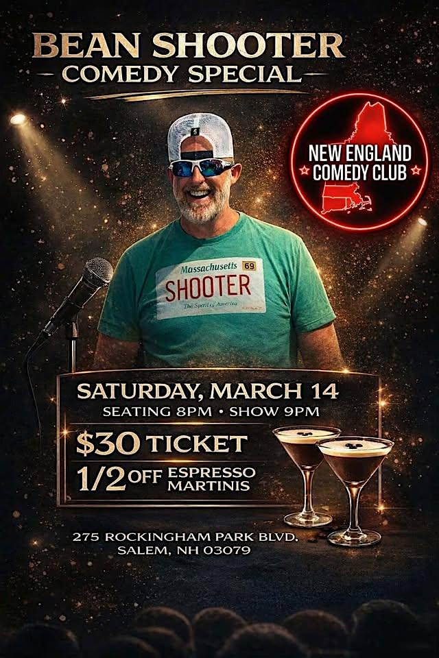 by admin05Mar Bean Shooter Comedy Special at Ya Mas Greek Taverna & Bar – Salem, NH Bean Shooter Comedy Special at Ya Mas Greek Taverna & Bar – Salem, NH 1 1 people viewed this event. Bean Shooters Comedy Debut launches with a killer lineup of raw, uncensored stand up – plus great food and 1/2 off espresso martinis! Tickets-RSVP Link Date And Time Saturday, March 14th, 2026 09:00 PM (PST) Venue Ya Mas Greek Taverna & Bar Location 275 Rockingham Park Boulevard, Salem, NH 3079 Event Types Concert or PerformanceFilm, Media & Entertainment Event Category New Hampshire Share With Friends Facebook Twitter Linkedin Xing Pinterest Share This Post: