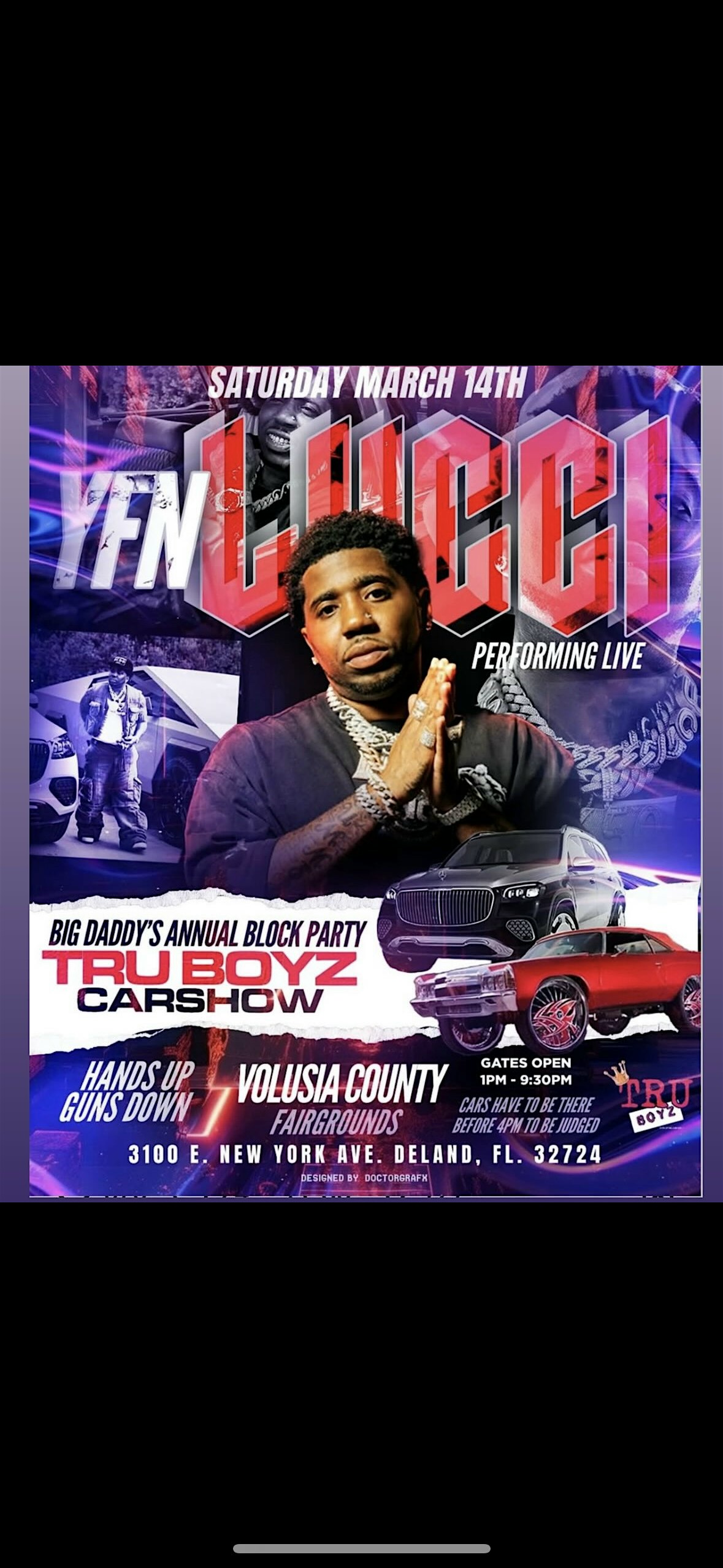 by admin13Feb Big Daddy’s Block Party + Tru Boyz Car Show w/ YFN Lucci at 3150 E New York Ave – DeLand, FL Big Daddy’s Block Party + Tru Boyz Car Show w/ YFN Lucci at 3150 E New York Ave – DeLand, FL 1 1 people viewed this event. March 14 , 2026 Big Daddy’s annual car show. Lucci will be performing live. Hand up Guns down positive vibes only ‼️‼️ Tickets-RSVP Link Date And Time Saturday, March 14th, 2026 05:00 PM (PST) Venue 3150 E New York Ave Location 3150 East New York Avenue, DeLand, FL 32724 Event Types Concert or PerformanceMusic Event Category Daytona BeachFlorida Share With Friends Facebook Twitter Linkedin Xing Pinterest Share This Post: