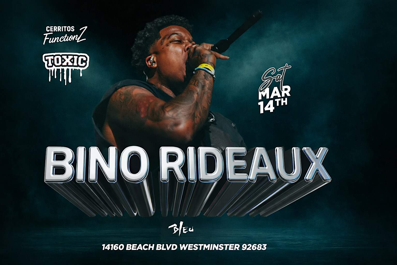 by admin05Mar BINO PERFORMING LIVE @ BLEU NIGHT CLUB, SAT MARCH 14TH | 18+ at Bleu Restaurant & Dancing – Westminster, CA BINO PERFORMING LIVE @ BLEU NIGHT CLUB, SAT MARCH 14TH | 18+ at Bleu Restaurant & Dancing – Westminster, CA 2 2 people viewed this event. Bino Performing Live Tickets-RSVP Link Date And Time Saturday, March 14th, 2026 10:00 PM (PDT) Venue Bleu Restaurant & Dancing Location 14160 Beach Boulevard, Westminster, CA 92683 Event Types MusicParty or Social Gathering Event Category California Share With Friends Facebook Twitter Linkedin Xing Pinterest Share This Post: