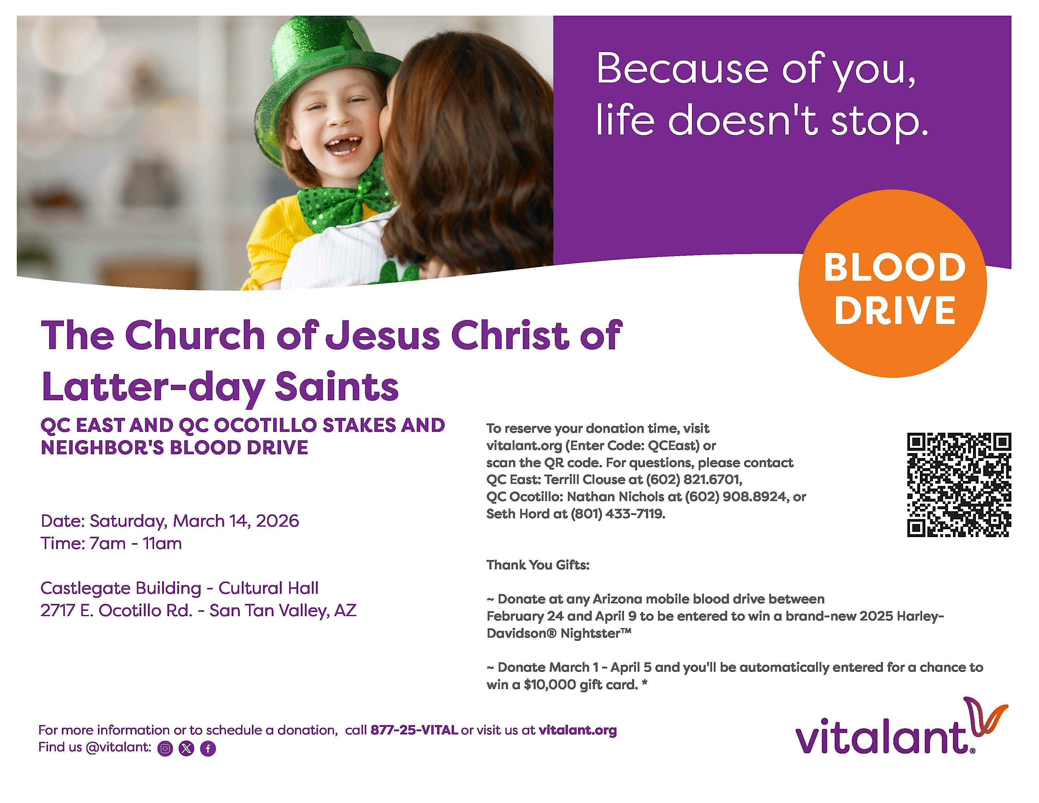 by admin13Feb Blood Drive – San Tan Valley – March 14th at The Church of Jesus Christ of Latter-day Saints – San Tan Valley, AZ Blood Drive – San Tan Valley – March 14th at The Church of Jesus Christ of Latter-day Saints – San Tan Valley, AZ 1 1 people viewed this event. Come donate blood! To reserve your time slot, register at vitalant.org and enter code QCEast. Tickets-RSVP Link Date And Time Saturday, March 14th, 2026 02:00 PM (PST) Venue The Church of Jesus Christ of Latter-day Saints Location 2717 E Ocotillo Rd, San Tan Valley, AZ 85140 Event Types Music Event Category Arizona Share With Friends Facebook Twitter Linkedin Xing Pinterest Share This Post: