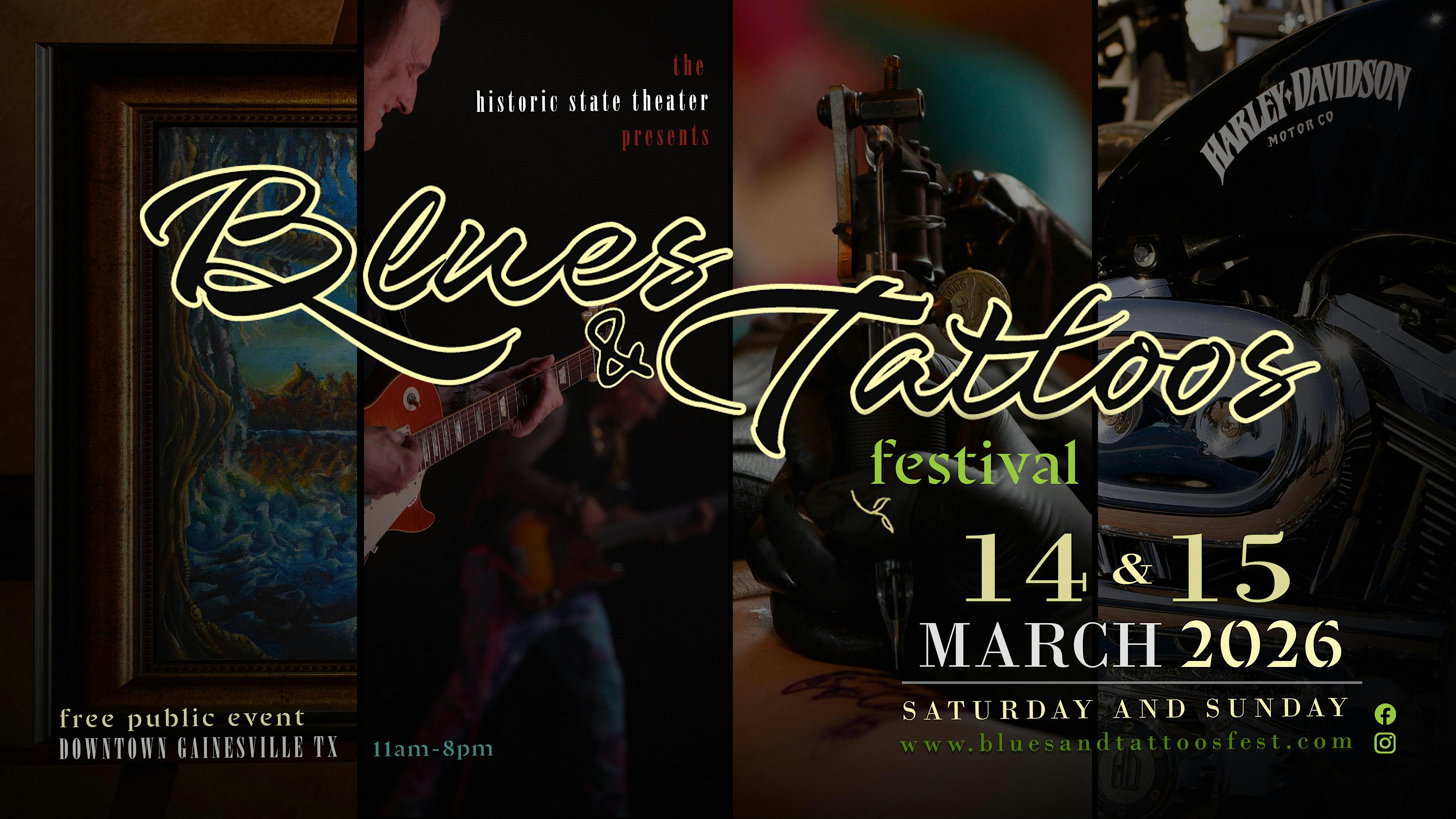 by admin27Feb Blues & Tattoos Festival at State Theater – Gainesville, TX Blues & Tattoos Festival at State Theater – Gainesville, TX 2 2 people viewed this event. 2 Days of Live Blues, Onsite Tattoos, Custom Motorcycle Show by HD, Art Gallery, TX Cornhole Tournament, Vendors, Foodtrucks, & Family Area Tickets-RSVP Link Date And Time Saturday, March 14th, 2026 11:00 AM (PST) Venue State Theater Location 200 East California Street, Gainesville, TX 76240 Event Types Festival or FairMusic Event Category Texas Share With Friends Facebook Twitter Linkedin Xing Pinterest Share This Post: