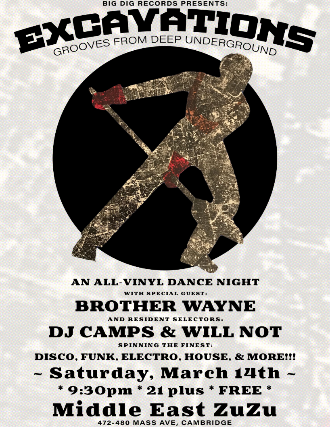 21+ w/Valid I.D. NO I.D.=NO ADMISSIONThe Middle East & ZuZu present: – Excavations w/ Brother Wayne, DJ Camps, & DJ Will Not – 21+ 9:30pm doors NO VAPING OR SMOKING IN THE BUILDING*** DINE and SKIP the Line ***