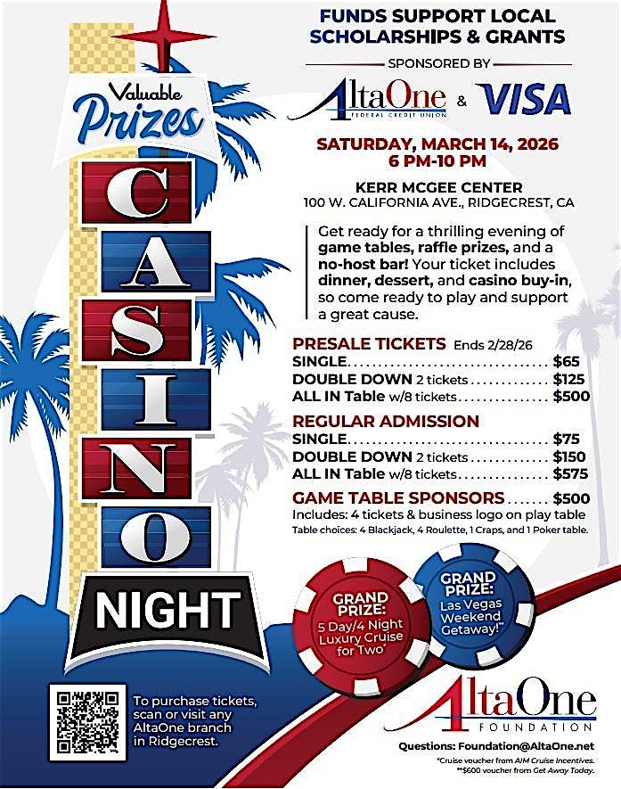 by admin27Feb Casino Night Fundraiser at 100 W California Ave – Ridgecrest, CA Casino Night Fundraiser at 100 W California Ave – Ridgecrest, CA 1 1 people viewed this event. Enjoy an exciting night of games, raffles, and a no-host bar. Your ticket includes dinner, dessert, and casino buy-in—all for a great cause. Tickets-RSVP Link Date And Time Saturday, March 14th, 2026 @ 06:00 PM Location 100 West California Avenue, Ridgecrest, CA 93555 Event Types Charity & CausesParty or Social Gathering Event Category California Share With Friends Facebook Twitter Linkedin Xing Pinterest Share This Post: