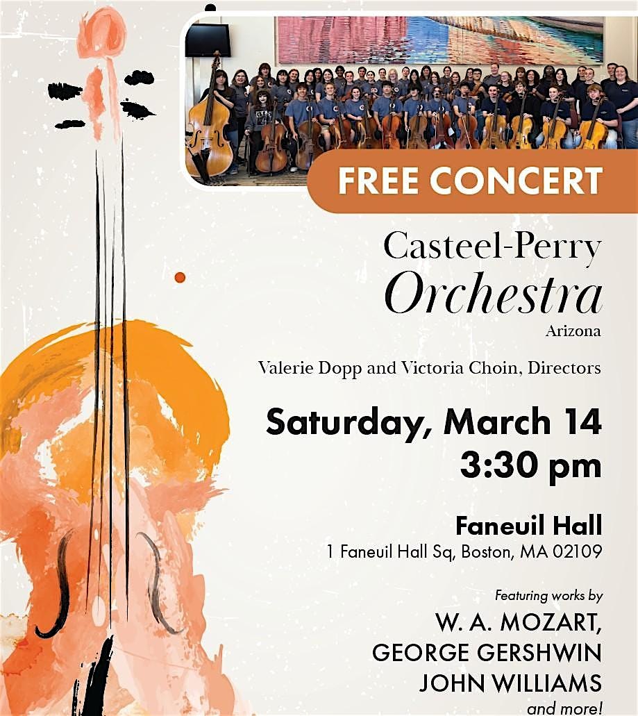by admin05Mar Casteel-Perry Orchestra at Faneuil Hall – Boston, MA Casteel-Perry Orchestra at Faneuil Hall – Boston, MA 1 1 people viewed this event. The Casteel-Perry Orchestra is proud to present an afternoon of orchestral classics as the historic Faneuil Great Hall! Tickets-RSVP Link Date And Time Saturday, March 14th, 2026 03:00 PM (PST) Venue Faneuil Hall Location 1 Faneuil Hall Square, Boston, MA 2109 Event Types Concert or PerformanceMusic Event Category BostonMassachusetts Share With Friends Facebook Twitter Linkedin Xing Pinterest Share This Post: