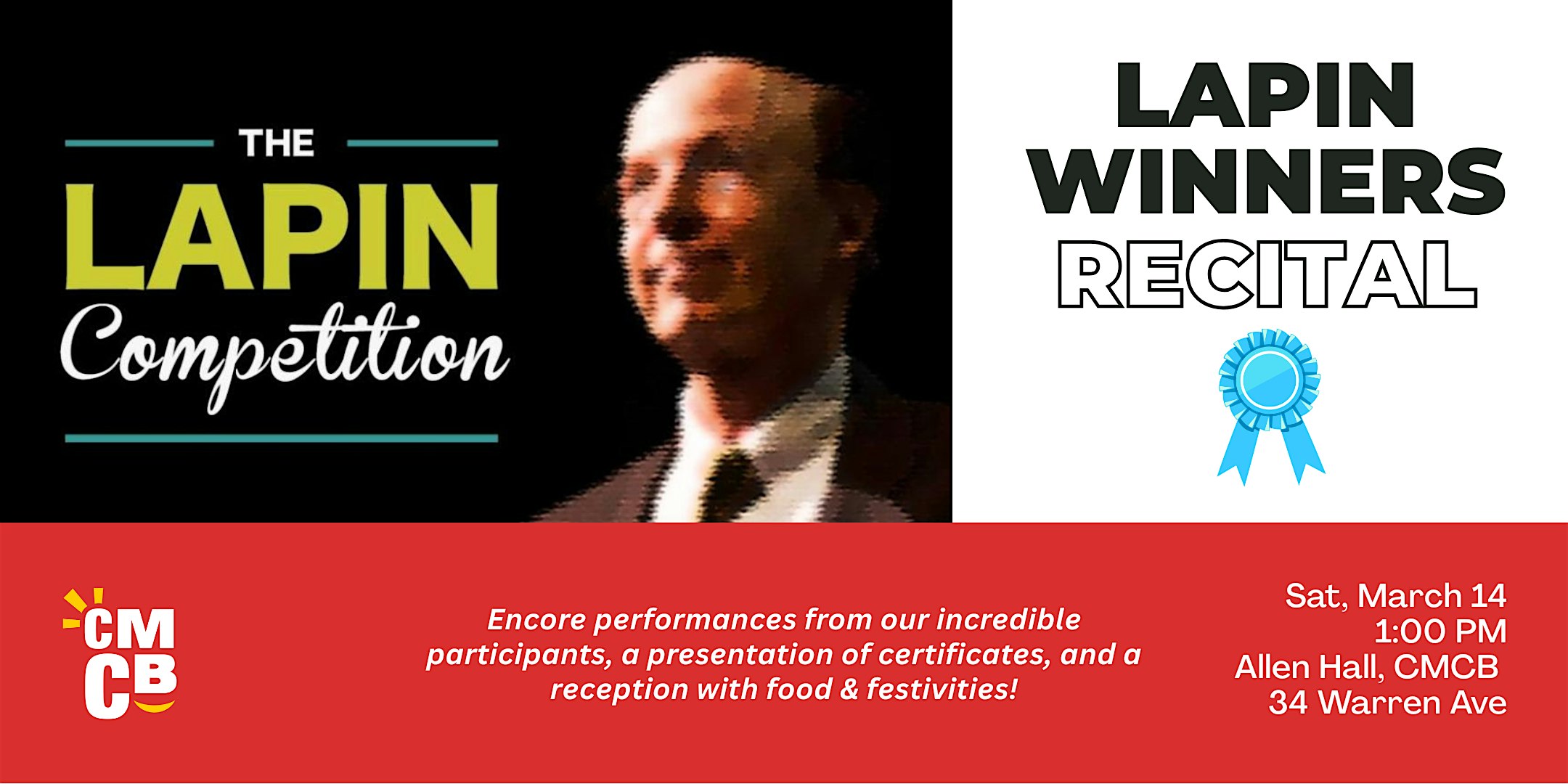 by admin27Feb CMCB Lapin Competition: Winners Recital at Community Music Center of Boston – Allen Hall – Boston, MA CMCB Lapin Competition: Winners Recital at Community Music Center of Boston – Allen Hall – Boston, MA 1 1 people viewed this event. A recital featuring participants of our 2026 Lapin Competition. Tickets-RSVP Link Date And Time Saturday, March 14th, 2026 01:00 PM (PST) Venue Community Music Center of Boston - Allen Hall Location 34 Warren Avenue, Boston, MA 2116 Event Types Concert or PerformanceMusic Event Category BostonMassachusetts Share With Friends Facebook Twitter Linkedin Xing Pinterest Share This Post: