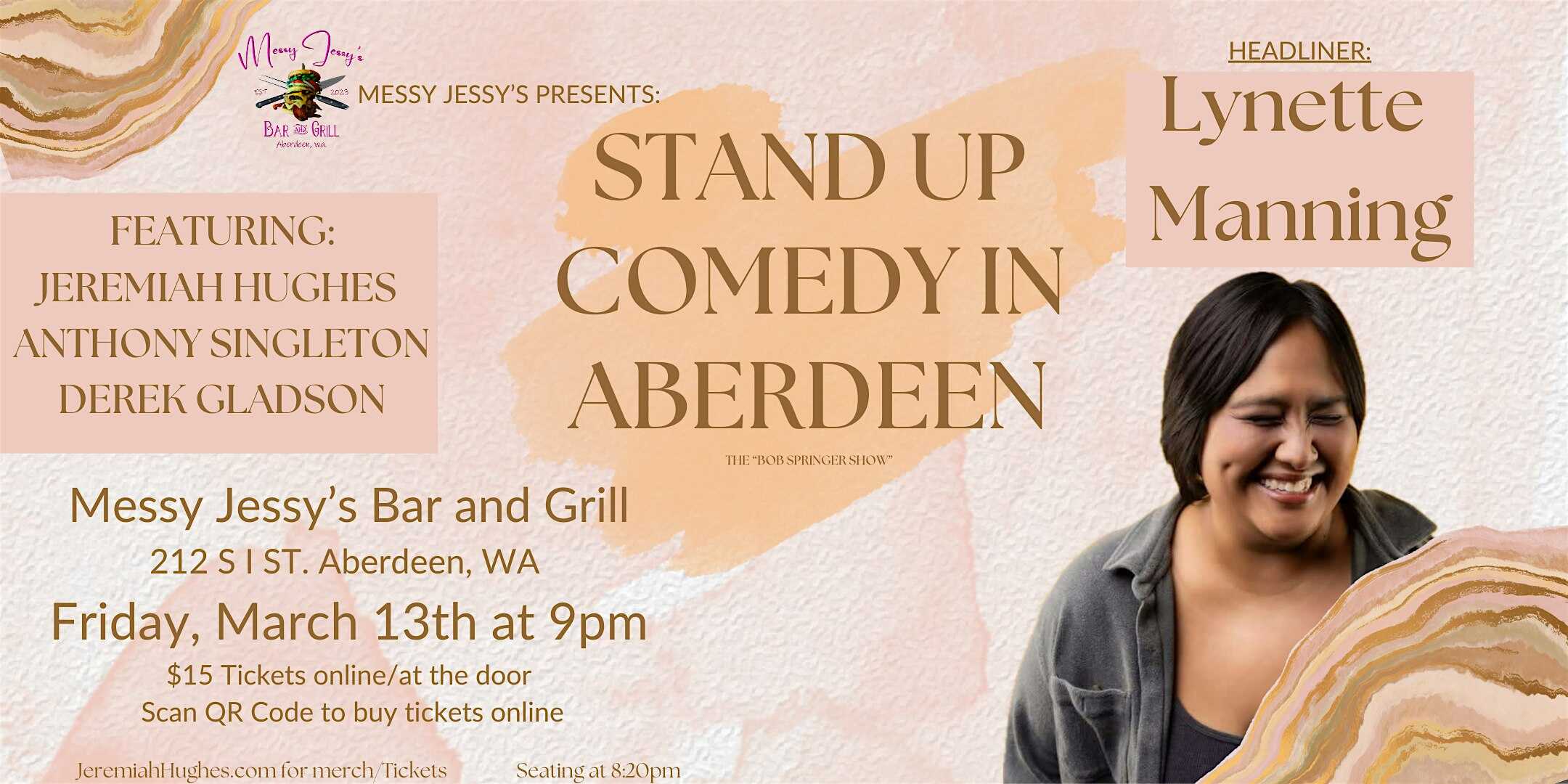 by admin14Feb Comedy at Messy Jessy’s with Lynette Manning at Messy Jessy’s Bar and Grill – Aberdeen, WA Comedy at Messy Jessy’s with Lynette Manning at Messy Jessy’s Bar and Grill – Aberdeen, WA 2 2 people viewed this event. Grays Harbor’s BEST monthly comedy show for over 2 years. Come see why the “Bob Springer Show” is the best around! Tickets-RSVP Link Date And Time Saturday, March 14th, 2026 04:00 AM (PST) Venue Messy Jessy's Bar and Grill Location 212 South I Street, Aberdeen, WA 98520 Event Types Concert or PerformancePerforming & Visual Arts Event Category Washington Share With Friends Facebook Twitter Linkedin Xing Pinterest Share This Post: