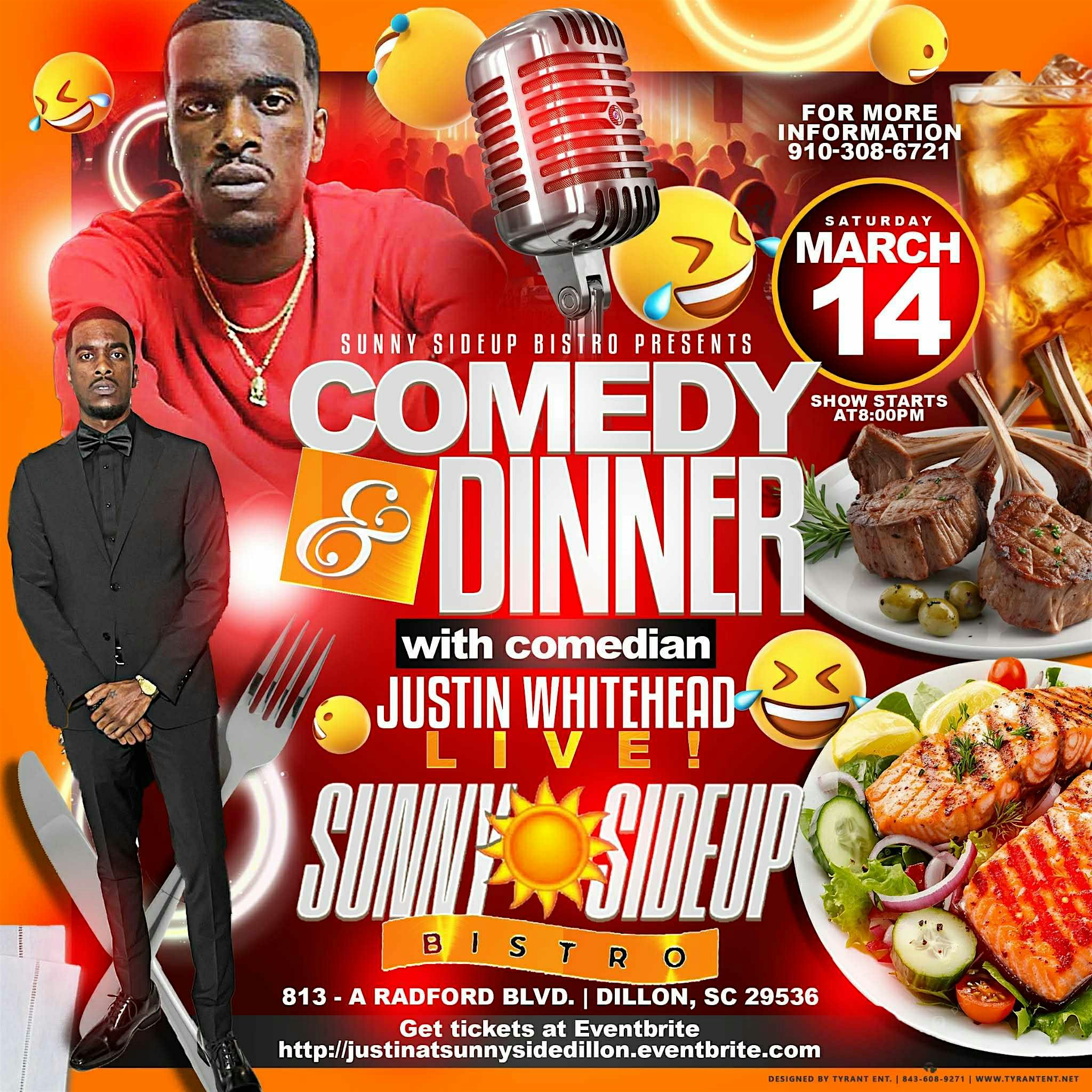 by admin24Feb COMEDY & DINNER WITH JUSTIN WHITEHEAD at 813 Radford Blvd – Dillon, SC COMEDY & DINNER WITH JUSTIN WHITEHEAD at 813 Radford Blvd – Dillon, SC 2 2 people viewed this event. Get ready to laugh your socks off while enjoying a tasty dinner with Justin Whitehead live and in person! Tickets-RSVP Link Date And Time Saturday, March 14th, 2026 07:00 PM (PST) Venue 813 Radford Blvd Location 813 Radford Boulevard, Dillon, SC 29536 Event Types Food & Drink Event Category South Carolina Share With Friends Facebook Twitter Linkedin Xing Pinterest Share This Post:
