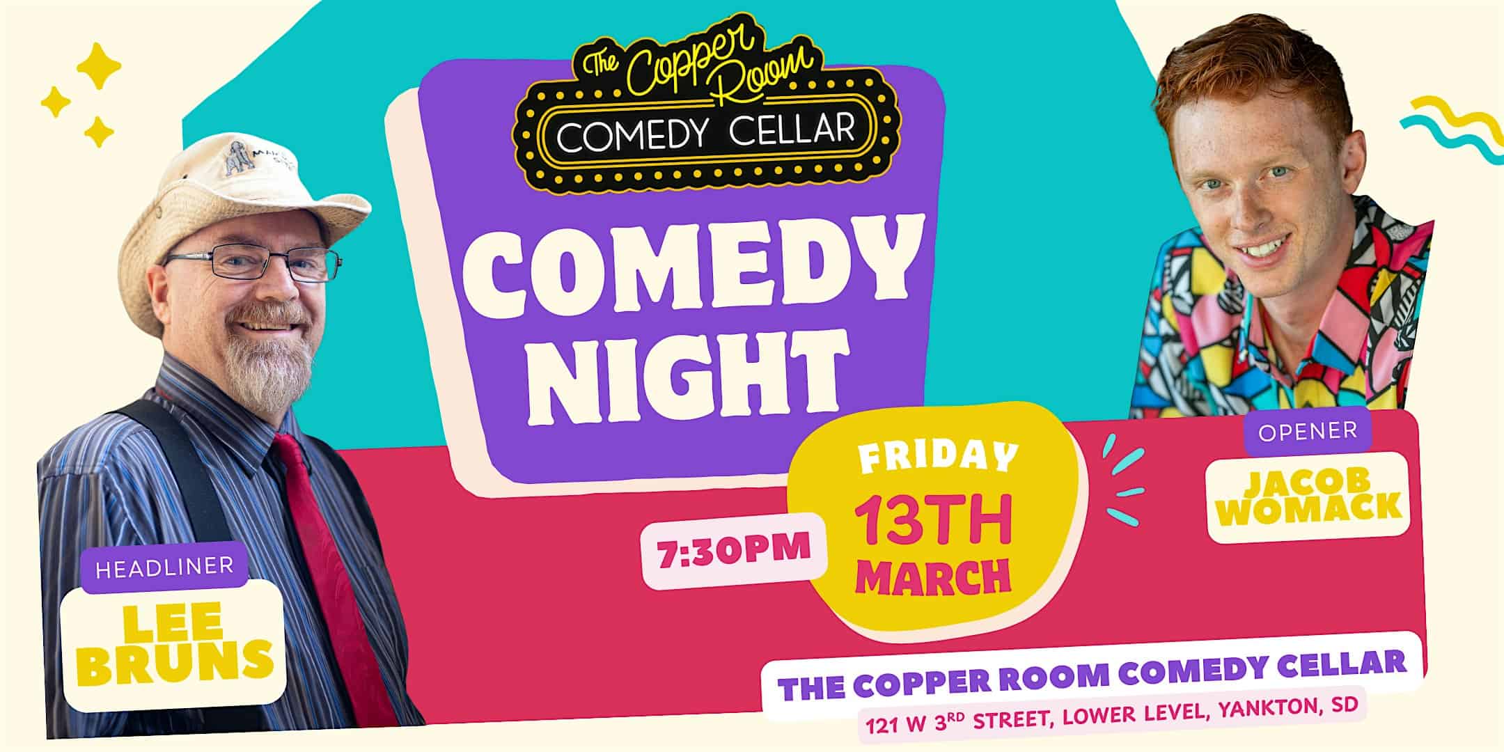 by admin14Feb Comedy Night with Lee Bruns and Jacob Womack at The Copper Room Lounge – Yankton, SD Comedy Night with Lee Bruns and Jacob Womack at The Copper Room Lounge – Yankton, SD 2 2 people viewed this event. Join us for a hilarious night of comedy with Lee Bruns and Jacob Womack- you won’t want to miss out on the laughs! Tickets-RSVP Link Date And Time Saturday, March 14th, 2026 12:00 AM (PST) Venue The Copper Room Lounge Location 121 West 3rd Street, Yankton, SD 57078 Event Types Concert or PerformancePerforming & Visual Arts Event Category South Dakota Share With Friends Facebook Twitter Linkedin Xing Pinterest Share This Post: