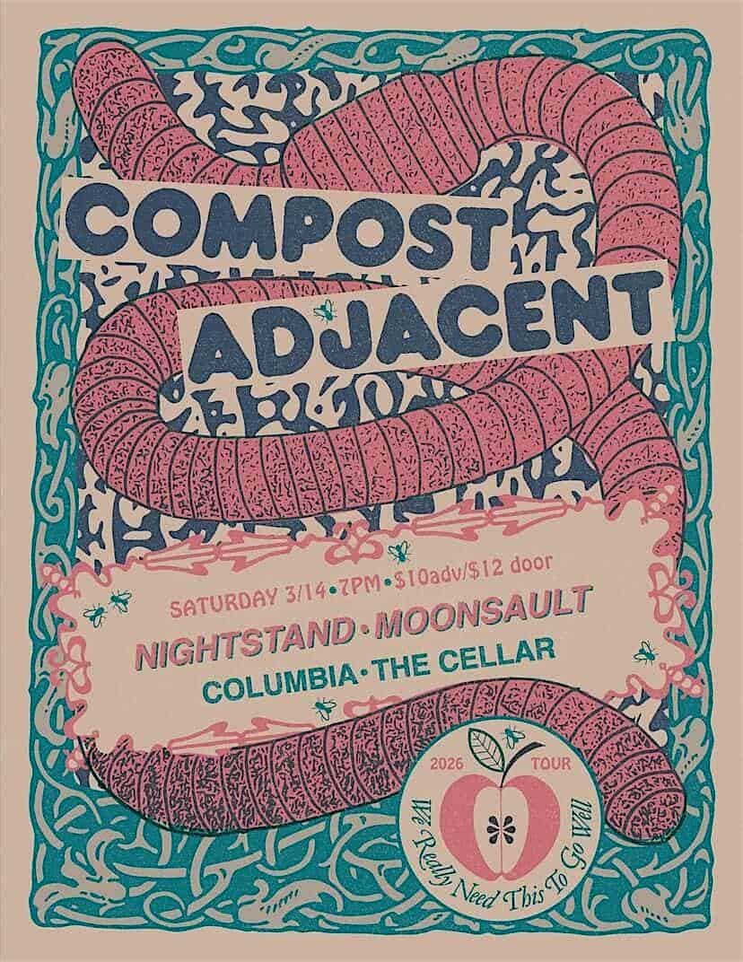 by admin23Feb COMPOST ADJACENT at 2614 Calvert Dr d – Columbia, MO COMPOST ADJACENT at 2614 Calvert Dr d – Columbia, MO 2 2 people viewed this event. COMPOST ADJACENT WITH NIGHTSTAND & MOONSAULT Tickets-RSVP Link Date And Time Saturday, March 14th, 2026 07:00 PM (PST) Venue 2614 Calvert Dr d Location 2614 Calvert Drive, Columbia, MO 65202 Event Types Concert or PerformanceMusic Event Category Missouri Share With Friends Facebook Twitter Linkedin Xing Pinterest Share This Post: