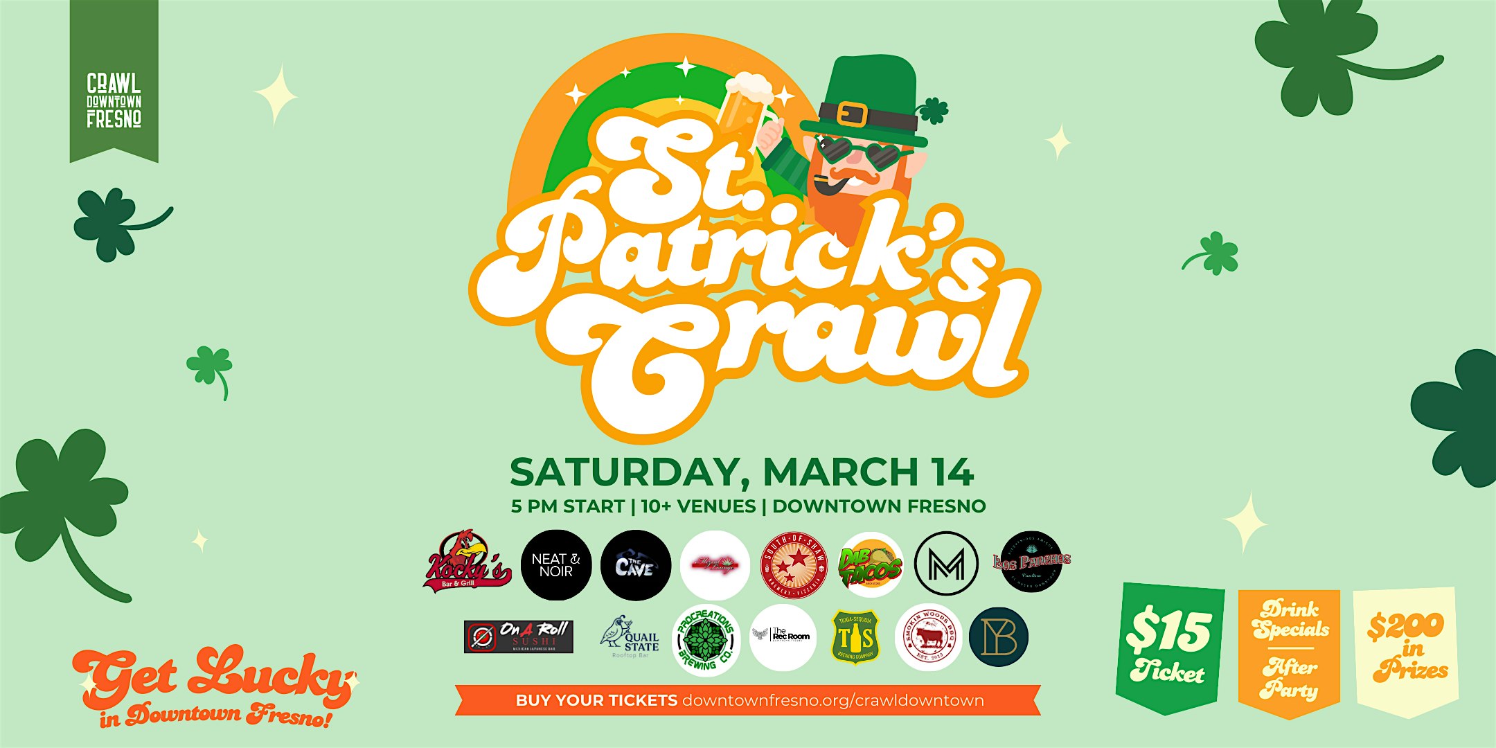 by admin27Feb Crawl Downtown: St. Patrick’s Bar Crawl at 1060 Fulton St – Fresno, CA Crawl Downtown: St. Patrick’s Bar Crawl at 1060 Fulton St – Fresno, CA 1 1 people viewed this event. Follow the pot of gold and join us for a St. Patrick’s pub crawl adventure across 10+ Downtown Fresno venues on Saturday, March 14, 2026! Tickets-RSVP Link Date And Time Saturday, March 14th, 2026 @ 05:00 PM Location 1060 Fulton Street, Fresno, CA 93721 Event Types Food & DrinkParty or Social Gathering Event Category California Share With Friends Facebook Twitter Linkedin Xing Pinterest Share This Post: