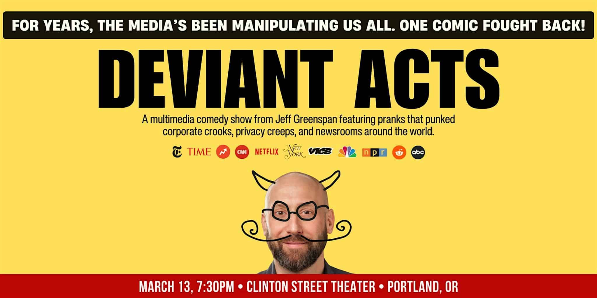 by admin14Feb D&D Comedy Presents: Jeff Greenspan in Deviant Acts at Clinton Street Theater – Portland, OR D&D Comedy Presents: Jeff Greenspan in Deviant Acts at Clinton Street Theater – Portland, OR 1 1 people viewed this event. A solo show from comedian Jeff Greenspan featuring pranks that punked corporate crooks, privacy creeps, and newsrooms from around the world. Tickets-RSVP Link Date And Time Saturday, March 14th, 2026 02:00 AM (PST) Venue Clinton Street Theater Location 2522 Southeast Clinton Street, Portland, OR 97202 Event Types Concert or PerformancePerforming & Visual Arts Event Category OregonPortland Share With Friends Facebook Twitter Linkedin Xing Pinterest Share This Post: