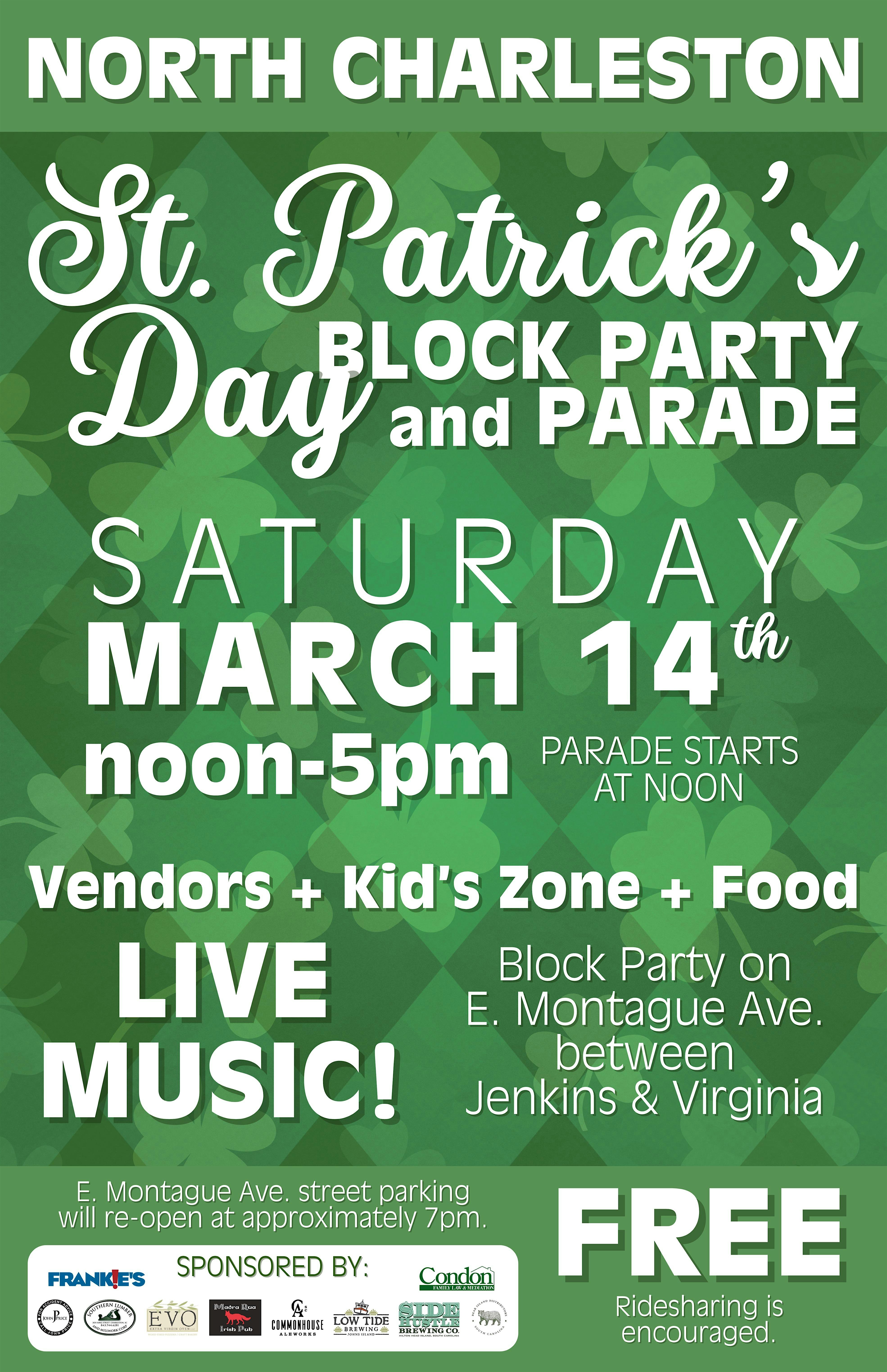 by admin27Feb DIG’s St. Patrick’s Day Event at DIG In The Park – North Charleston, SC DIG’s St. Patrick’s Day Event at DIG In The Park – North Charleston, SC 1 1 people viewed this event. Join DIG during the Park Circle St. Patrick’s Day Parade & Block Party! We will have live music, food truck & drinks! Tickets-RSVP Link Date And Time Saturday, March 14th, 2026 @ 12:00 PM Location 1049 East Montague Avenue, North Charleston, SC 29405 Event Types Party or Social GatheringSeasonal & Holiday Event Category CharlestonSouth Carolina Share With Friends Facebook Twitter Linkedin Xing Pinterest Share This Post: