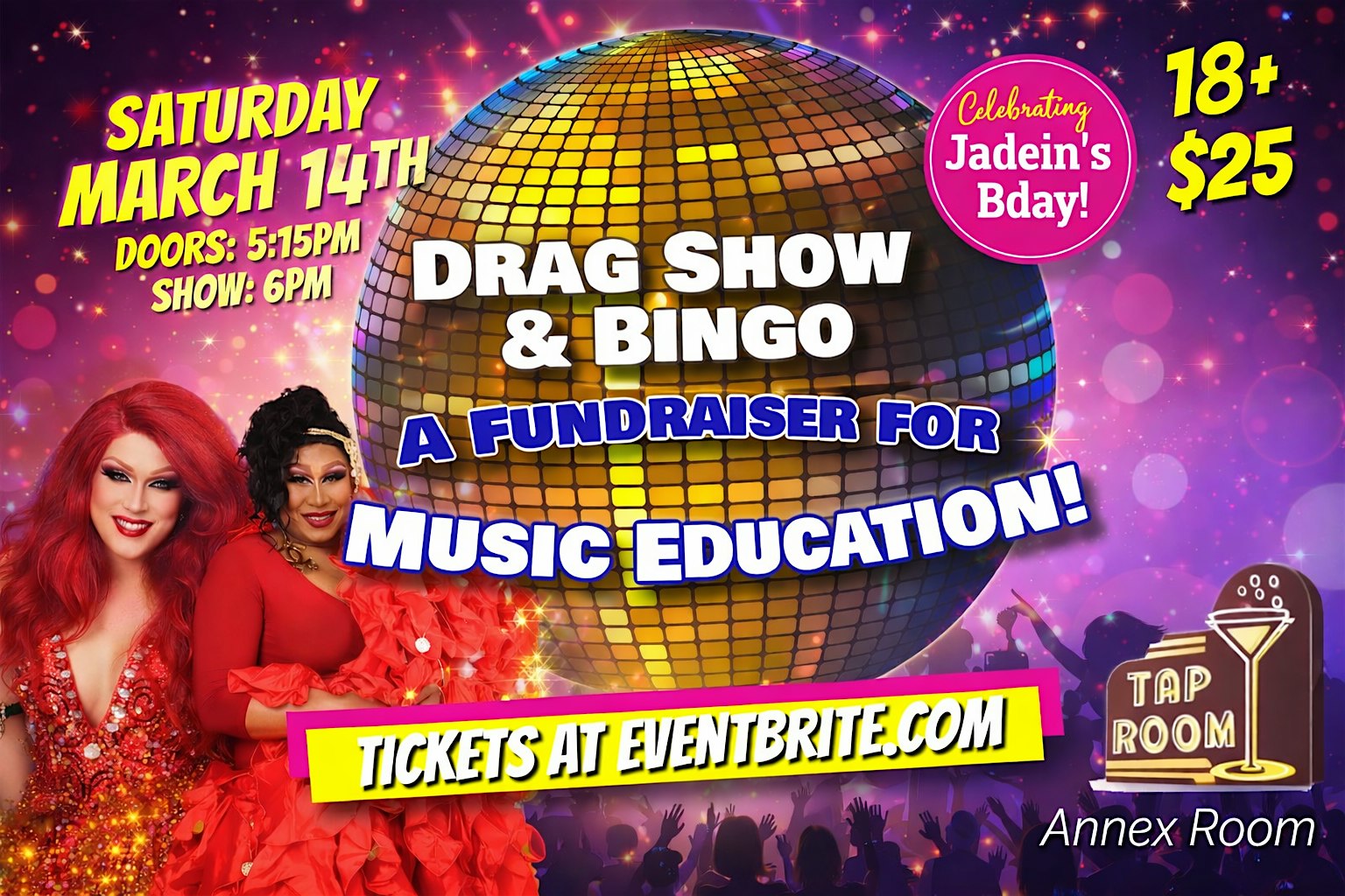 by admin24Feb Drag Bingo and Show for Music Education Celebrating Jadeins Bday! at Tap Room – Ypsilanti, MI Drag Bingo and Show for Music Education Celebrating Jadeins Bday! at Tap Room – Ypsilanti, MI 3 3 people viewed this event. Join us for Drag Bingo and a fabulous show to celebrate Jadein’s birthday and support music education! Tickets-RSVP Link Date And Time Saturday, March 14th, 2026 05:00 PM (PST) Venue Tap Room Location 201 West Michigan Avenue, Ypsilanti, MI 48197 Event Types Community & CultureParty or Social Gathering Event Category Ann ArborMichigan Share With Friends Facebook Twitter Linkedin Xing Pinterest Share This Post: