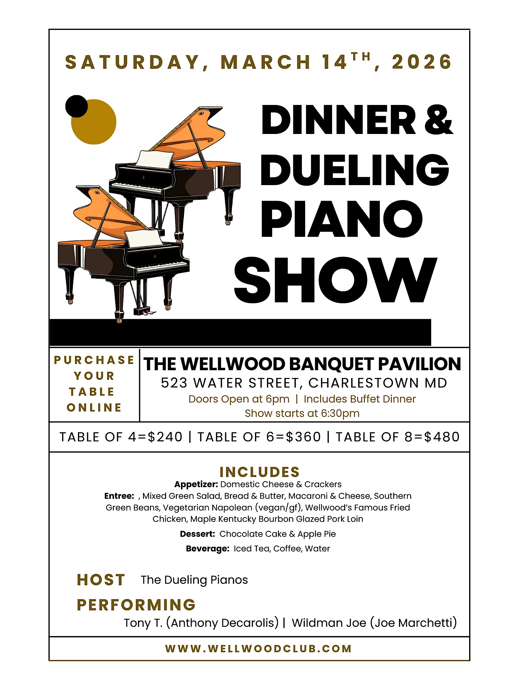 by admin24Feb Dueling Pianos Dinner & Show at Wellwood Pavilion – Charlestown, MD Dueling Pianos Dinner & Show at Wellwood Pavilion – Charlestown, MD 2 2 people viewed this event. Saturday March 14, 2026 Dueling Piano Dinner & Show Get ready for an unforgettable night of music, laughter, and great food! Tickets-RSVP Link Date And Time Saturday, March 14th, 2026 06:00 PM (PST) Venue Wellwood Pavilion Location 523 Water Street, Charlestown, MD 21914 Event Types Concert or PerformanceMusic Event Category Maryland Share With Friends Facebook Twitter Linkedin Xing Pinterest Share This Post: