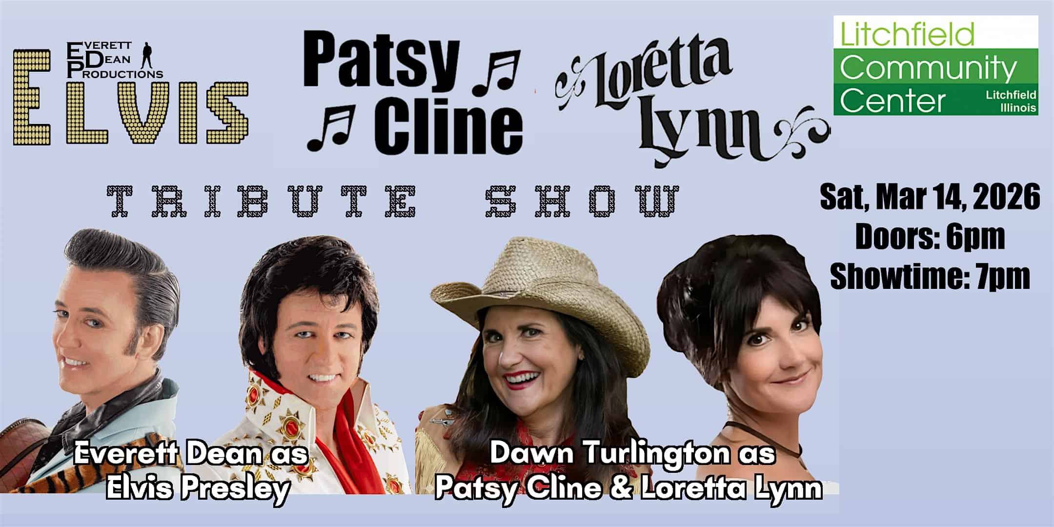 by admin23Feb ELVIS PRESLEY, PATSY CLINE, AND LORETTA LYNN TRIBUTE SHOW IN LITCHFIELD, IL at Litchfield Community Center – Litchfield, IL ELVIS PRESLEY, PATSY CLINE, AND LORETTA LYNN TRIBUTE SHOW IN LITCHFIELD, IL at Litchfield Community Center – Litchfield, IL 1 1 people viewed this event. ELVIS PRESLEY, PATSY CLINE, AND LORETTA LYNN TRIBUTE SHOW IN LITCHFIELD, ILLINOIS (Litchfield Community Center) Tickets-RSVP Link Date And Time Saturday, March 14th, 2026 07:00 PM (PST) Venue Litchfield Community Center Location 1100 South State Street, Litchfield, IL 62056 Event Types Concert or PerformanceMusic Event Category Illinois Share With Friends Facebook Twitter Linkedin Xing Pinterest Share This Post: