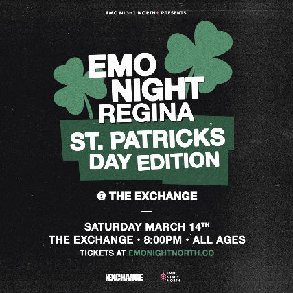 Calling emos of Regina, on Saturday March 14, Were celebrating St. Patricks Day at The Exchange! Well be spinning your fav classic emo anthems + MORE. See you there!Saturday March 14 2026The ExchangeDoors: 8pmEnd: 12amAll AgesTickets are non-refundable.