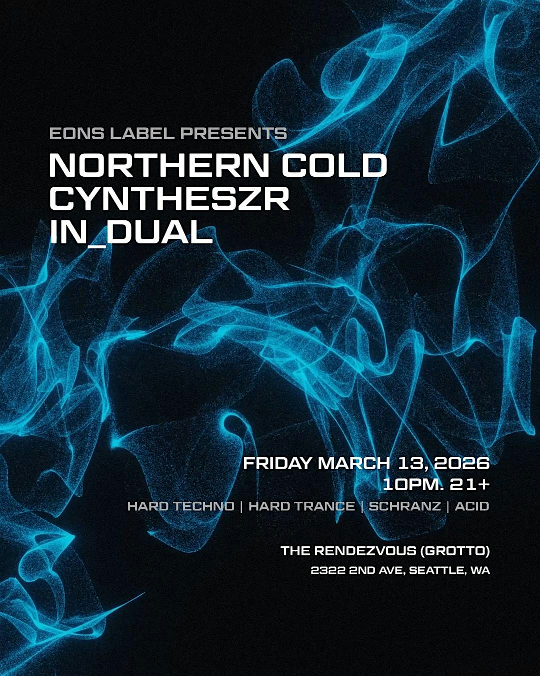 by admin13Feb EONS Label Presents: Northern Cold, CYNTHESZR, IN_DUAL at The Rendezvous – Seattle, WA EONS Label Presents: Northern Cold, CYNTHESZR, IN_DUAL at The Rendezvous – Seattle, WA 2 2 people viewed this event. High-energy hard techno, hard trance, schranz, and acid techno. An artist showcase presented by Seattle-based EONS Label. Tickets-RSVP Link Date And Time Saturday, March 14th, 2026 05:00 AM (PST) Venue The Rendezvous Location 2322 2nd Avenue, Seattle, WA 98121 Event Types Concert or PerformanceMusic Event Category SeattleWashington Share With Friends Facebook Twitter Linkedin Xing Pinterest Share This Post: