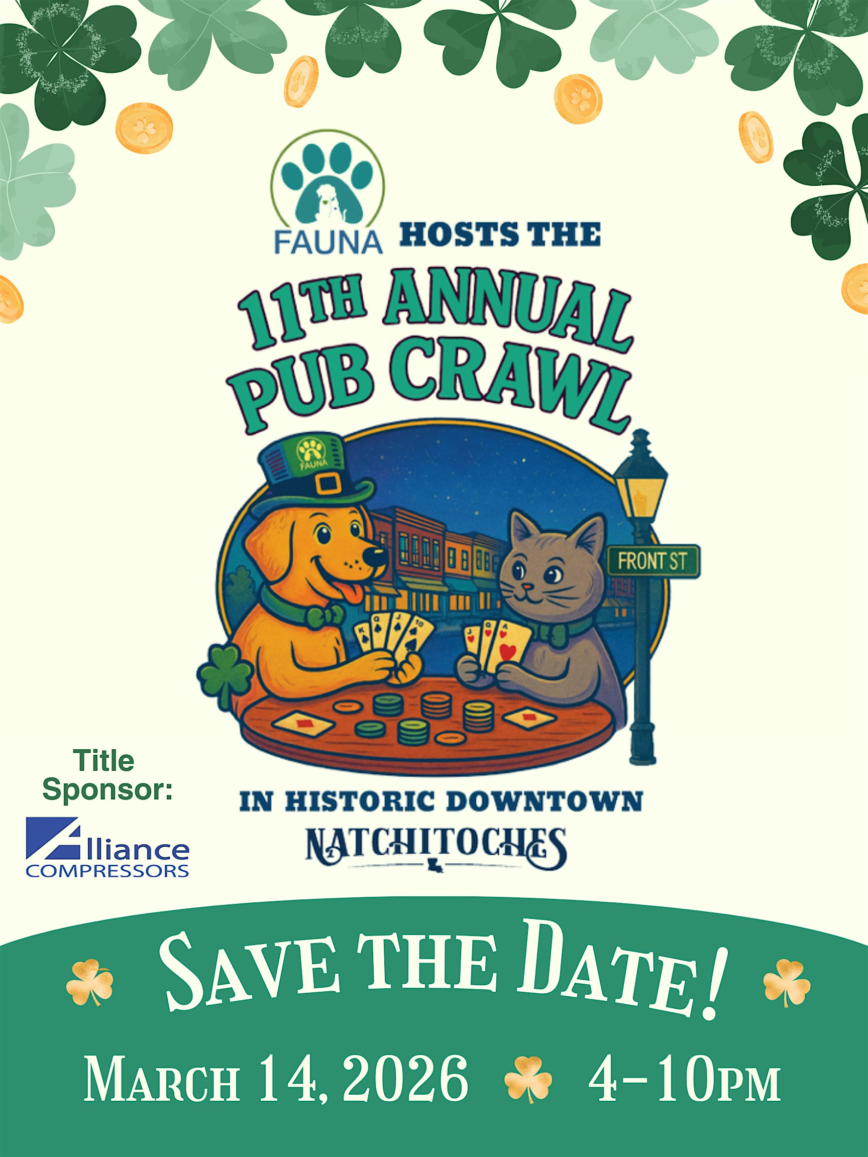 by admin13Feb FAUNA Hosts the 11th Annual Pub Crawl at Front Street & Church Street – Natchitoches, LA FAUNA Hosts the 11th Annual Pub Crawl at Front Street & Church Street – Natchitoches, LA 1 1 people viewed this event. Join us for a fun night on the bricks of Historic Natchitoches, LA for the 11th Annual St. Patrick’s Day Pub Crawl! (Presented by Alliance) Tickets-RSVP Link Date And Time Saturday, March 14th, 2026 09:00 PM (PST) Venue Front Street & Church Street Location Front Street & Church Street, Natchitoches, LA 71457 Event Types Food & DrinkParty or Social Gathering Event Category Louisiana Share With Friends Facebook Twitter Linkedin Xing Pinterest Share This Post: