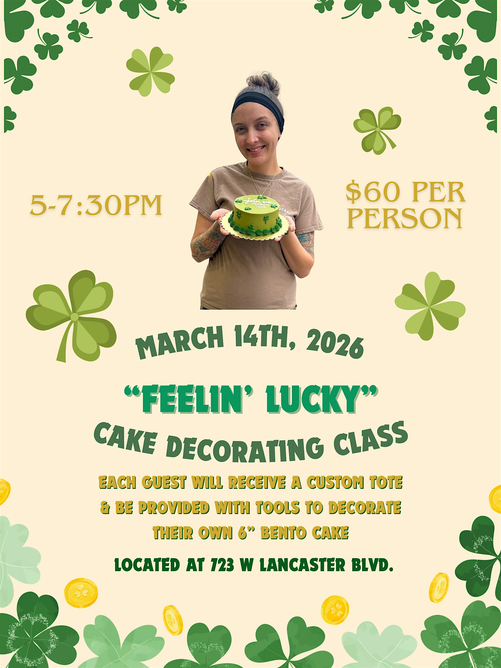 by admin24Feb Feelin’ Lucky Cake Decorating Class at 723 W Lancaster Blvd – Lancaster, CA Feelin’ Lucky Cake Decorating Class at 723 W Lancaster Blvd – Lancaster, CA 2 2 people viewed this event. Get creative and lucky with us in this fun, hands-on cake decorating class—sweet skills guaranteed! Tickets-RSVP Link Date And Time Saturday, March 14th, 2026 05:00 PM (PST) Venue 723 W Lancaster Blvd Location 723 West Lancaster Boulevard, Lancaster, CA 93534 Event Types Food & Drink Event Category California Share With Friends Facebook Twitter Linkedin Xing Pinterest Share This Post: