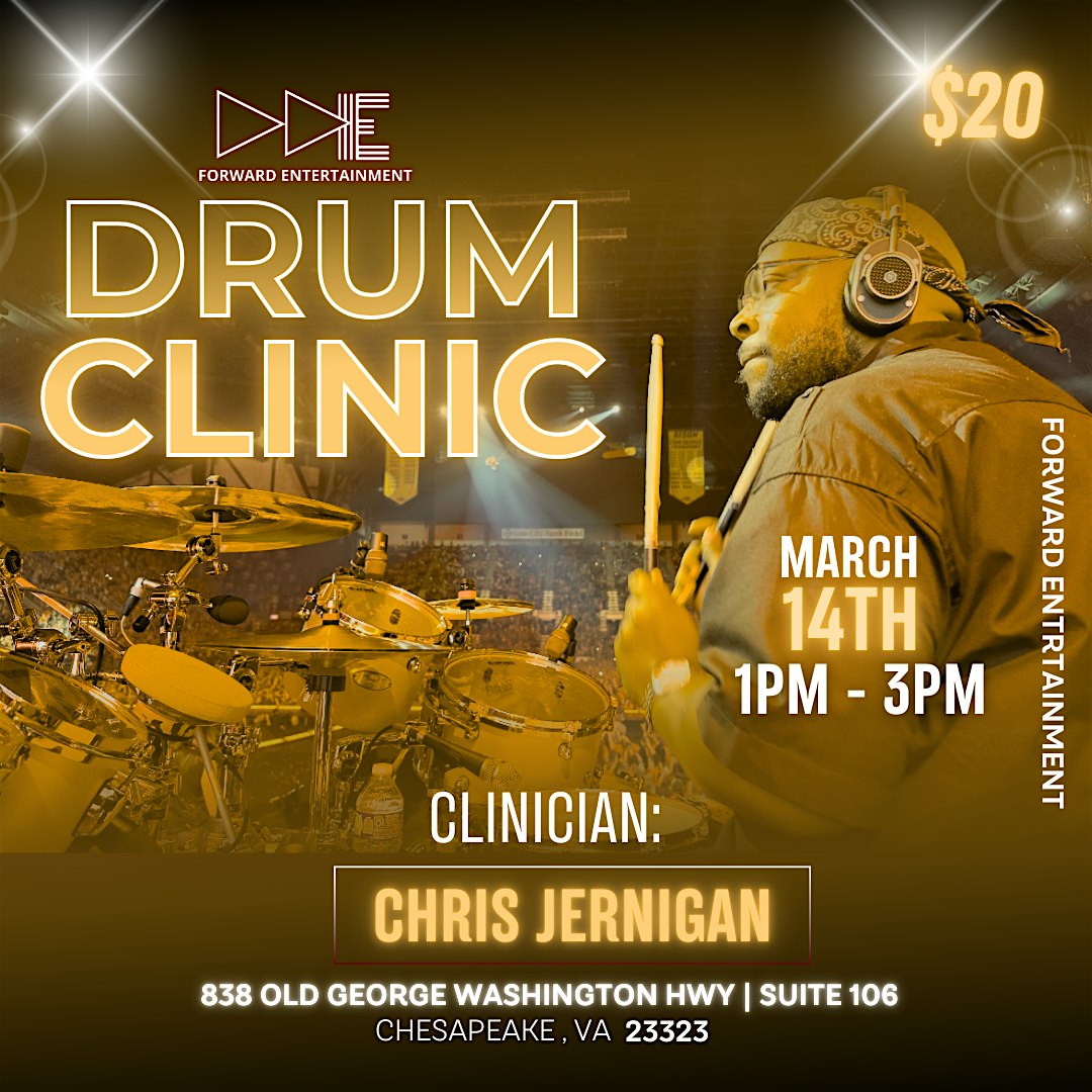 Forward Entertainment Drum Clinic at Rock City VA – Chesapeake, VA Forward Entertainment Drum Clinic at Rock City VA – Chesapeake, VA 1 1 people viewed this event. Clinician Chris Jernigan brings real world experience and practical insight that you can actually apply. Tickets-RSVP Link Register for event Date And Time Saturday, March 14th, 2026 @ 01:00 PM Location 838 Old George Washington Highway North, Chesapeake, VA 23323 Event Types Class, Training, or WorkshopMusic Event Category NorfolkVirginia Share With Friends Facebook Twitter Linkedin Xing Pinterest