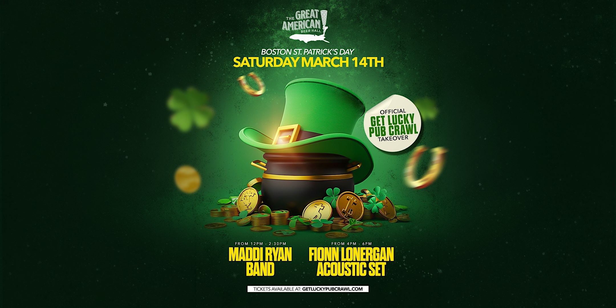 by admin27Feb Get Lucky Pub Crawl: Great American Beer Hall at The Great American Beer Hall – Medford, MA Get Lucky Pub Crawl: Great American Beer Hall at The Great American Beer Hall – Medford, MA 1 1 people viewed this event. Great American Beer Hall | Medford Check-In Performances By Maddi Ryan and Fionn Lonergan Tickets-RSVP Link Date And Time Saturday, March 14th, 2026 12:00 PM (PST) Venue The Great American Beer Hall Location 142 Mystic Avenue, Medford, MA 2155 Event Types Food & DrinkParty or Social Gathering Event Category Massachusetts Share With Friends Facebook Twitter Linkedin Xing Pinterest Share This Post: