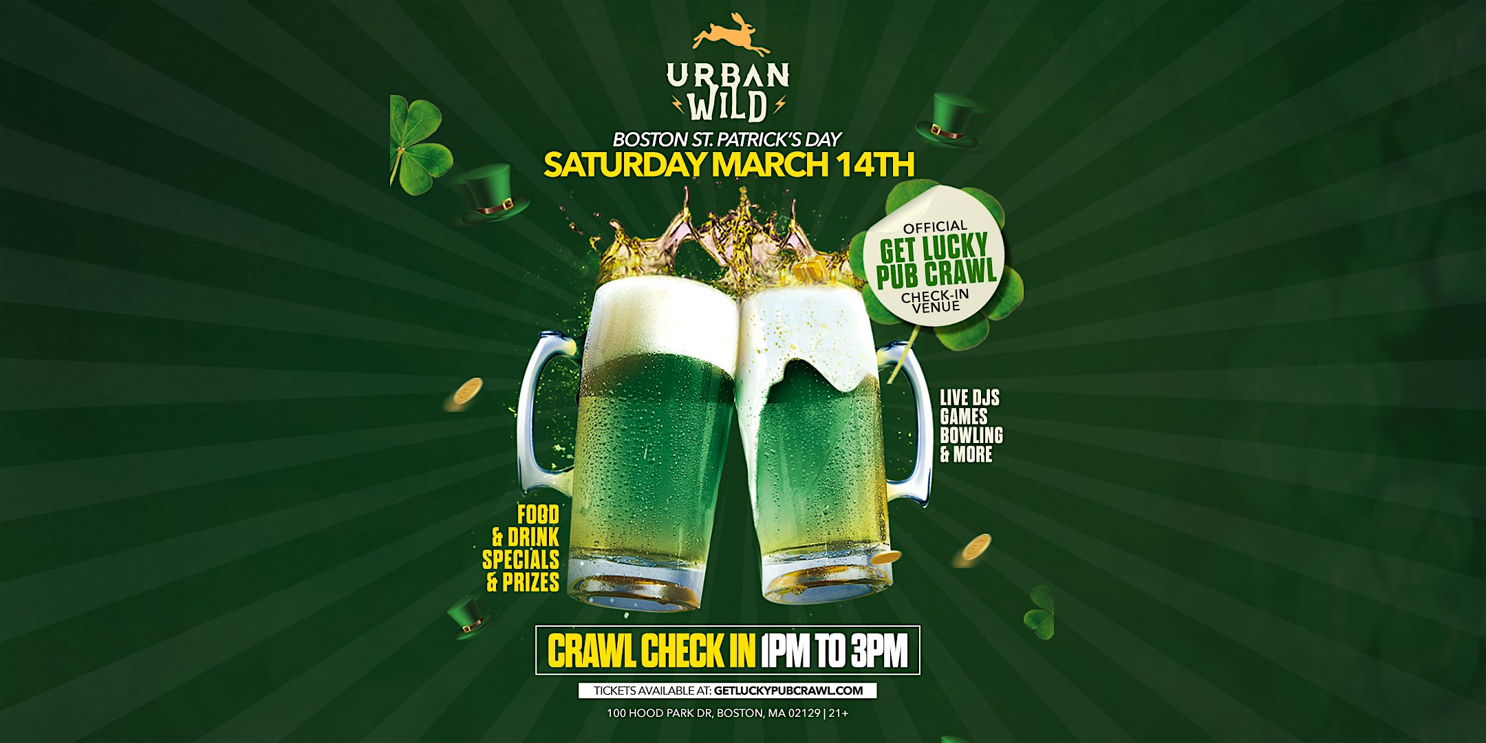 by admin27Feb Get Lucky Pub Crawl: Urban Wild at Urban Wild Boston – Boston, MA Get Lucky Pub Crawl: Urban Wild at Urban Wild Boston – Boston, MA 1 1 people viewed this event. Get Lucky Pub Crawl: Urban Wild Check-In Live Djs, Games, Bowling, and more Tickets-RSVP Link Date And Time Saturday, March 14th, 2026 12:00 PM (PST) Venue Urban Wild Boston Location 100 Hood Park Drive, Boston, MA 2129 Event Types Food & DrinkParty or Social Gathering Event Category BostonMassachusetts Share With Friends Facebook Twitter Linkedin Xing Pinterest Share This Post: