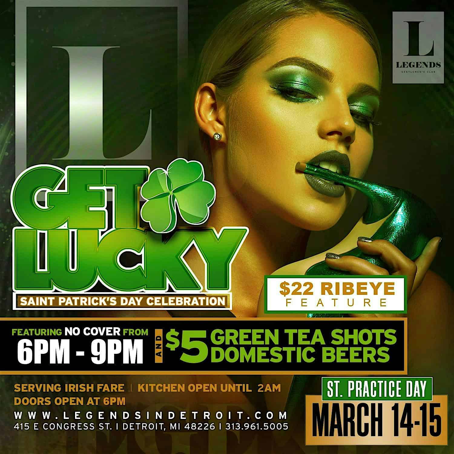 by admin23Feb Get Lucky: St. Practice & Patrick’s Day Celebration at Legends – Detroit, MI Get Lucky: St. Practice & Patrick’s Day Celebration at Legends – Detroit, MI 1 1 people viewed this event. 6PM-9PM: No Cover and $5 Green Tea & domestic beers. Kitchen is Open until 2AM! Tickets-RSVP Link Date And Time Saturday, March 14th, 2026 06:00 PM (PST) Venue Legends Location 415 E Congress, Detroit, MI 48226 Event Types Food & DrinkParty or Social Gathering Event Category DetroitMichigan Share With Friends Facebook Twitter Linkedin Xing Pinterest Share This Post: