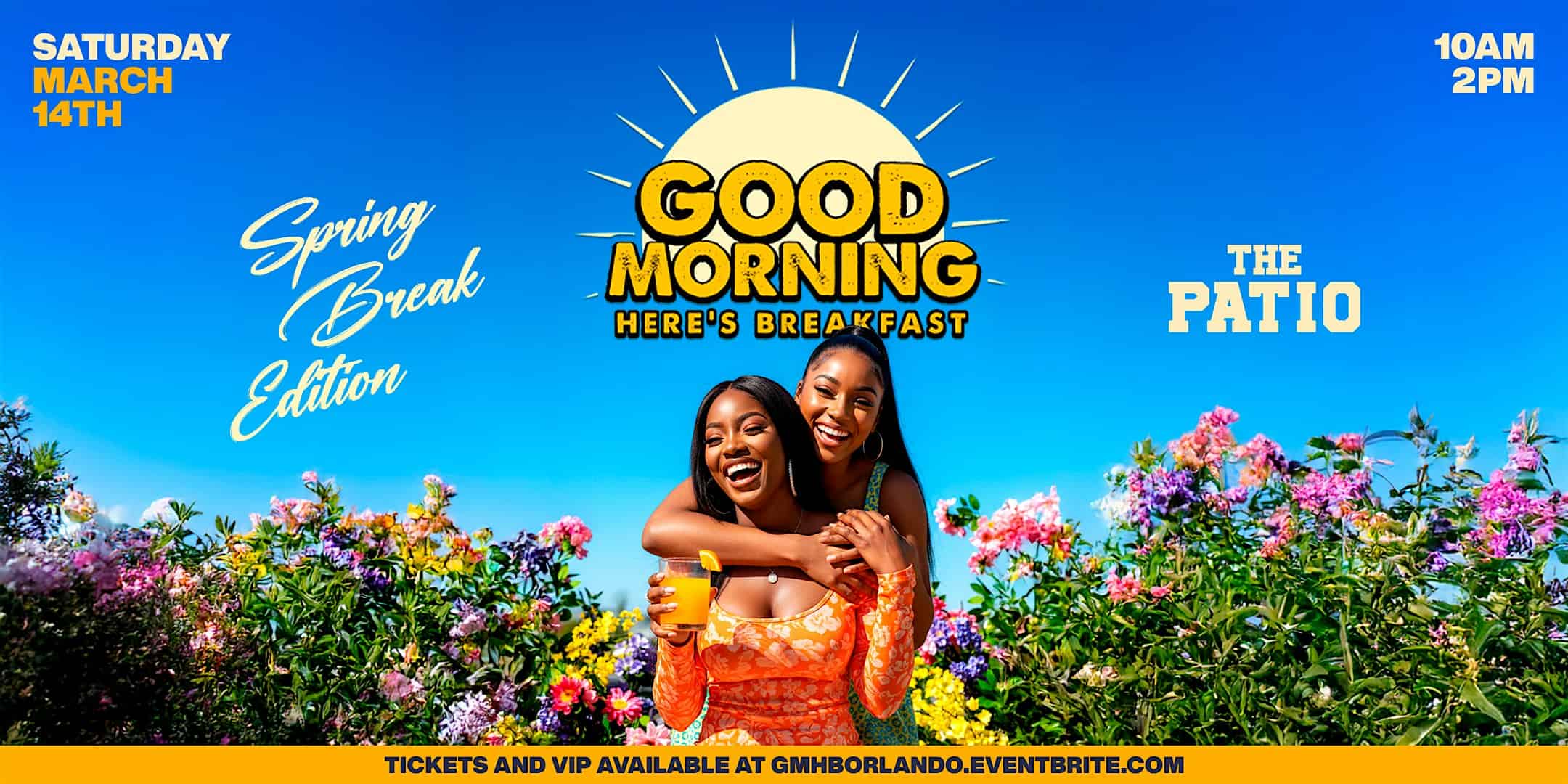 by admin23Feb GOOD MORNING, HERE’S BREAKFAST “SPRING BREAK” EDITION at The Patio – Orlando, FL GOOD MORNING, HERE’S BREAKFAST “SPRING BREAK” EDITION at The Patio – Orlando, FL 1 1 people viewed this event. SATURDAY 3/14, “GOOD MORNING, HERE’S BREAKFAST “SPRING BREAK” EDITION AT THE PATIO! Tickets-RSVP Link Date And Time Saturday, March 14th, 2026 10:00 AM (PST) Venue The Patio Location 14A West Washington Street, Orlando, FL 32801 Event Types Food & DrinkParty or Social Gathering Event Category FloridaOrlando Share With Friends Facebook Twitter Linkedin Xing Pinterest Share This Post: