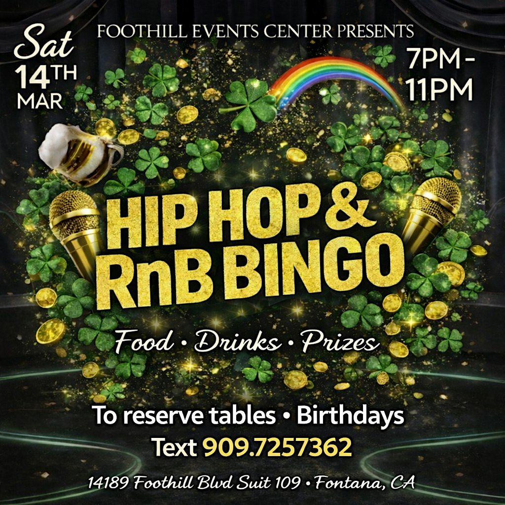 by admin24Feb HIP HOP RNB BINGO 2YR ANNIVERSARY at 14189 Foothill Blvd, Fontana, CA, USA – Fontana, CA HIP HOP RNB BINGO 2YR ANNIVERSARY at 14189 Foothill Blvd, Fontana, CA, USA – Fontana, CA 2 2 people viewed this event. Celebrate 2 years of HIP HOP RNB BINGO with live beats, fun vibes, and prizes in person! Tickets-RSVP Link Date And Time Saturday, March 14th, 2026 07:00 PM (PST) Venue 14189 Foothill Blvd, Fontana, CA, USA Location 14189 Foothill Boulevard, Fontana, CA 92335 Event Types MusicParty or Social Gathering Event Category California Share With Friends Facebook Twitter Linkedin Xing Pinterest Share This Post: