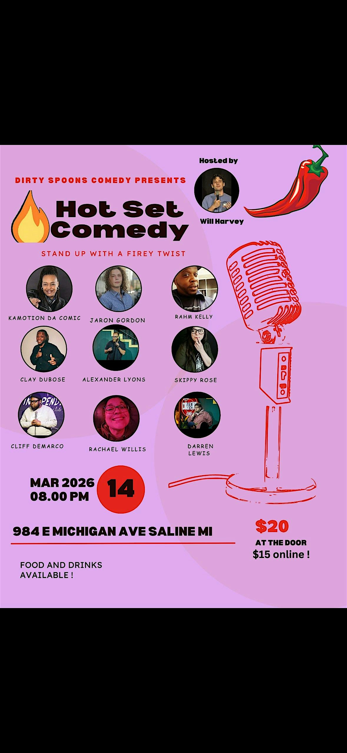 by admin05Mar Hot set comedy at 984 E Michigan Ave – Saline, MI Hot set comedy at 984 E Michigan Ave – Saline, MI 1 1 people viewed this event. 10 of the best comedians in the metro Detroit/ Michigan comedy scene will come on stage and attempt stand up after eating a ghost pepper ! Tickets-RSVP Link Date And Time Saturday, March 14th, 2026 07:00 PM (PST) Venue 984 E Michigan Ave Location 984 East Michigan Avenue, Saline, MI 48176 Event Types Concert or PerformancePerforming & Visual Arts Event Category Michigan Share With Friends Facebook Twitter Linkedin Xing Pinterest Share This Post: