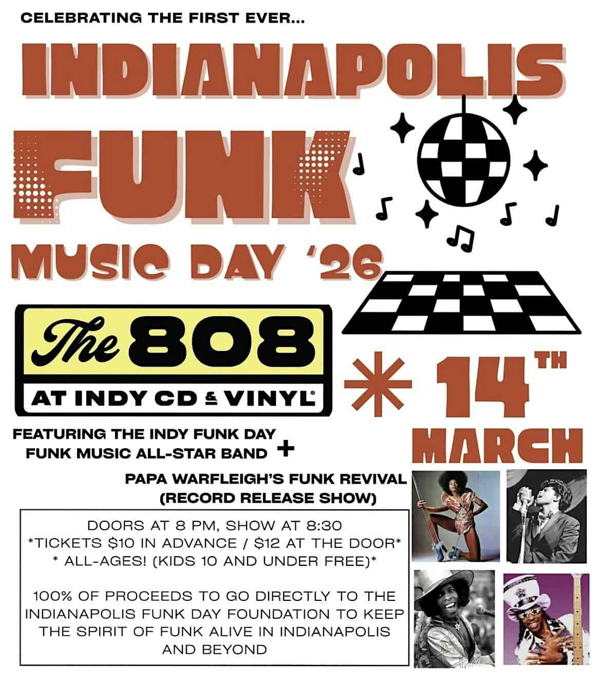 by admin23Feb Indy Funk Music Day 2026 Showcase at The 808 at The 808 at Indy CD & Vinyl – Indianapolis, IN Indy Funk Music Day 2026 Showcase at The 808 at The 808 at Indy CD & Vinyl – Indianapolis, IN 1 1 people viewed this event. The Inaugural INDY FUNK MUSIC DAY Fundraiser Showcase at The 808 feat the INDY FUNK DAY ALL-STAR FUNK BAND and PAPA WARFLEIGH’S FUNK REVIVAL Tickets-RSVP Link Date And Time Saturday, March 14th, 2026 08:00 PM (PST) Venue The 808 at Indy CD & Vinyl Location 808 Broad Ripple Avenue, Indianapolis, IN 46220 Event Types Concert or PerformanceMusic Event Category IndianaIndianapolis Share With Friends Facebook Twitter Linkedin Xing Pinterest Share This Post: