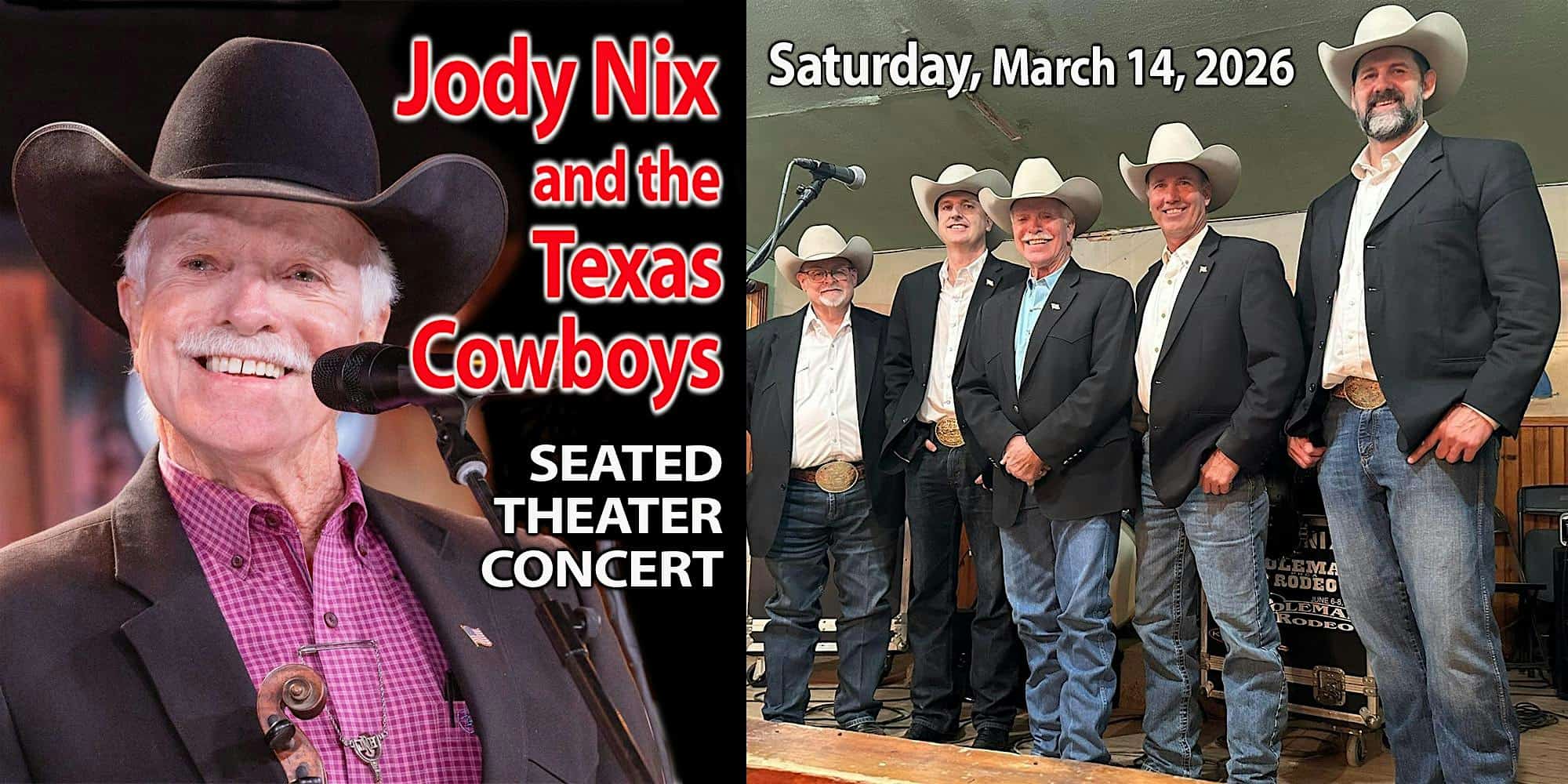 by admin23Feb Jody Nix and the Texas Cowboys – Seated Show – Live at Cactus Theater! at Cactus Theater – Lubbock, TX Jody Nix and the Texas Cowboys – Seated Show – Live at Cactus Theater! at Cactus Theater – Lubbock, TX 1 1 people viewed this event. First Cactus Appearance Tickets-RSVP Link Date And Time Saturday, March 14th, 2026 07:00 PM (PST) Venue Cactus Theater Location 1812 Buddy Holly Ave, Lubbock, TX 79401 Event Types Concert or PerformanceMusic Event Category Texas Share With Friends Facebook Twitter Linkedin Xing Pinterest Share This Post: