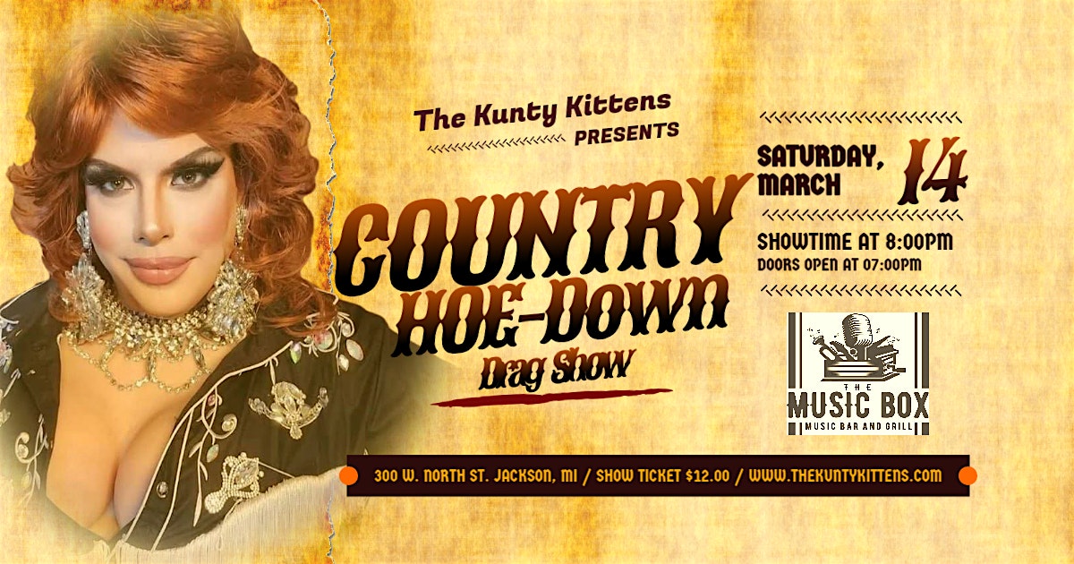 by admin05Mar KUNTry HOE-Down Drag Show at The Music Box – Jackson, MI KUNTry HOE-Down Drag Show at The Music Box – Jackson, MI 3 3 people viewed this event. It’s time to boot up and throw on them cowboy hats as The Kunty Kittens put the KUNT back in Country in Jackson March 14th at 8pm… Tickets-RSVP Link Date And Time Saturday, March 14th, 2026 08:00 PM (PST) Venue The Music Box Location 300 West North Street, Jackson, MI 49202 Event Types Concert or PerformancePerforming & Visual Arts Event Category Michigan Share With Friends Facebook Twitter Linkedin Xing Pinterest Share This Post: