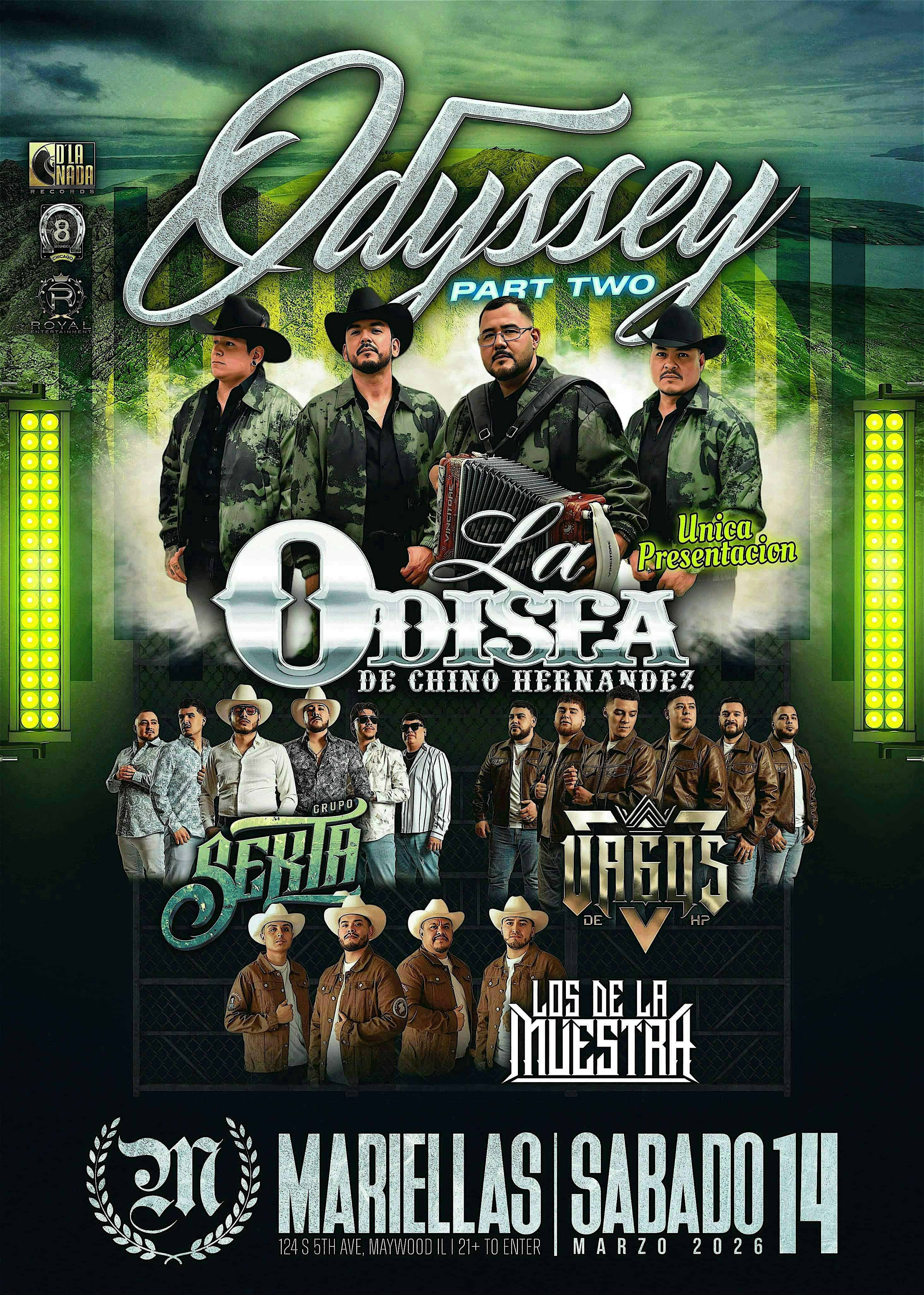 by admin23Feb LA ODISEA EN MARIELLAS at Mariella’s Banquets Inc – Maywood, IL LA ODISEA EN MARIELLAS at Mariella’s Banquets Inc – Maywood, IL 1 1 people viewed this event. El Gran Regreso De La Odisea Del Chino Hernandez A Chicago!!! Acompañado De Grandes Agrupaciones Un Evento Que No Puedes Perderte !! Tickets-RSVP Link Date And Time Saturday, March 14th, 2026 09:00 PM (PST) Venue Mariella's Banquets Inc Location 124 South 5th Avenue, Maywood, IL 60153 Event Types Concert or PerformanceMusic Event Category Illinois Share With Friends Facebook Twitter Linkedin Xing Pinterest Share This Post: