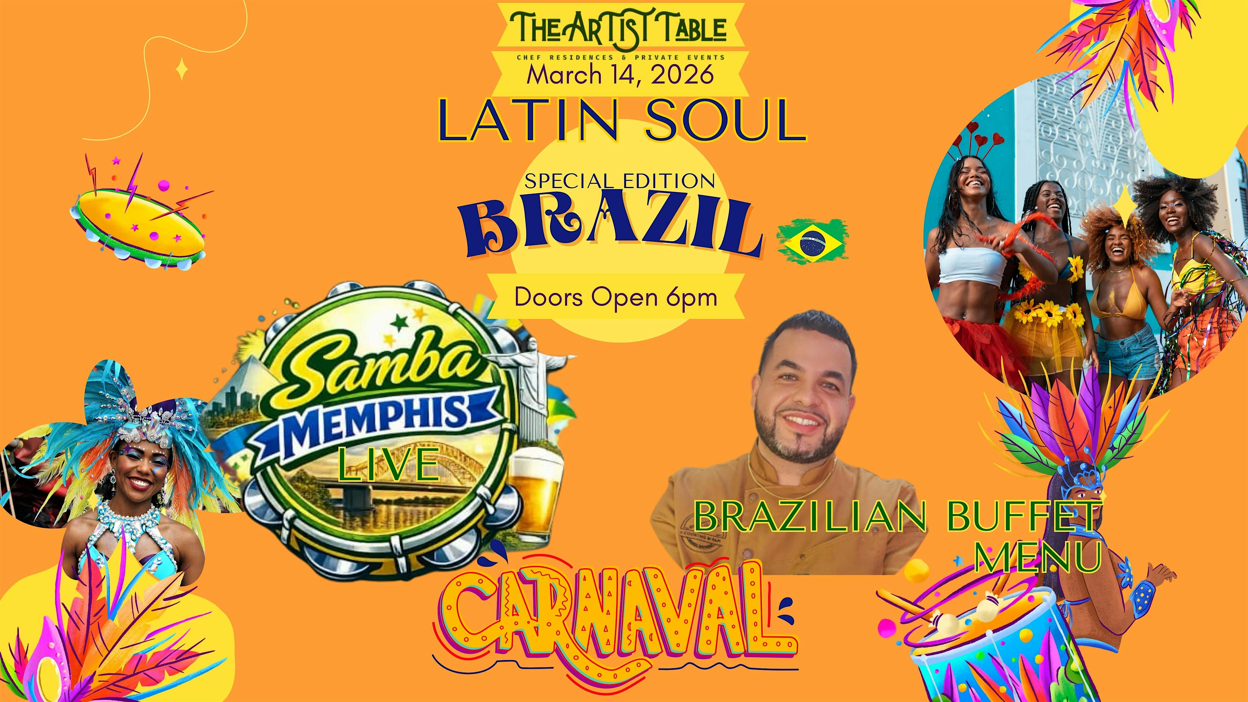 Latin Soul Carnaval Brazilian Buffet + Live Samba Memphis at The Artist Table – Memphis, TN Latin Soul Carnaval Brazilian Buffet + Live Samba Memphis at The Artist Table – Memphis, TN 1 1 people viewed this event. Live Samba. Brazilian buffet. Carnaval energy. Latin Soul takes over Memphis March 14 Tickets-RSVP Link Register for event Date And Time Saturday, March 14th, 2026 @ 06:00 PM Location 412 South Main Street, Memphis, TNĀ 38103 Event Types Dinner or GalaFood & Drink Event Category MemphisTennessee Share With Friends Facebook Twitter Linkedin Xing Pinterest