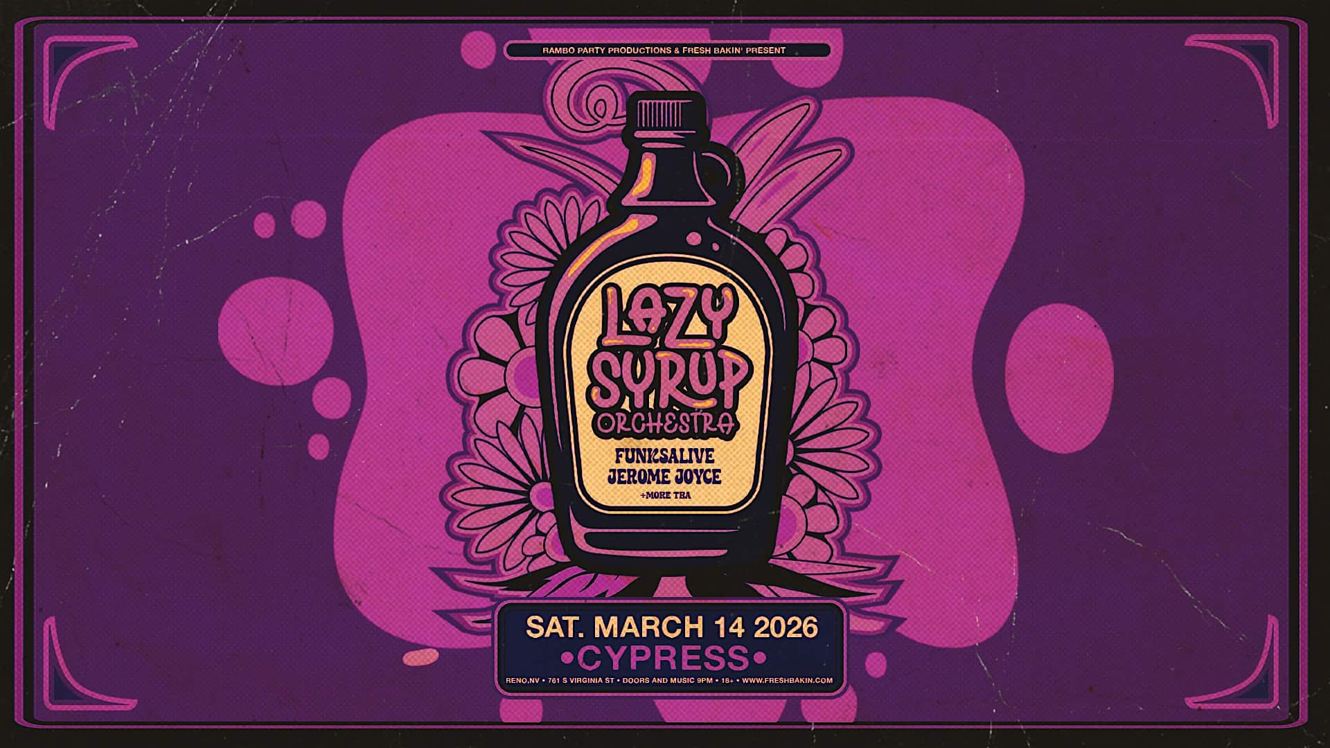 by admin23Feb Lazy Syrup Orchestra at Cypress at Cypress Music Venue & Private Events – Reno, NV Lazy Syrup Orchestra at Cypress at Cypress Music Venue & Private Events – Reno, NV 1 1 people viewed this event. Lazy Syrup Orchestra returns to Cypress in Reno on March 14, 2026. Tickets-RSVP Link Date And Time Saturday, March 14th, 2026 09:00 PM (PST) Venue Cypress Music Venue & Private Events Location 761 South Virginia Street, Reno, NV 89501 Event Types Concert or PerformanceMusic Event Category NevadaReno Share With Friends Facebook Twitter Linkedin Xing Pinterest Share This Post: