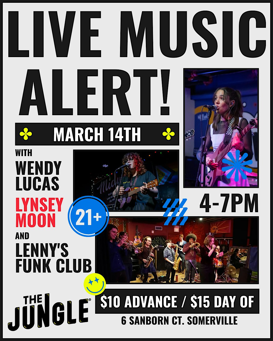 by admin13Feb Lenny’s Funk Club | Lynsey Moon | Wendy Lucas at The Jungle – Somerville, MA Lenny’s Funk Club | Lynsey Moon | Wendy Lucas at The Jungle – Somerville, MA 2 2 people viewed this event. Live Music at The Jungle Tickets-RSVP Link Date And Time Saturday, March 14th, 2026 08:00 PM (PST) Venue The Jungle Location 6 Sanborn Court, Somerville, MA 2143 Event Types Concert or PerformanceMusic Event Category Massachusetts Share With Friends Facebook Twitter Linkedin Xing Pinterest Share This Post: