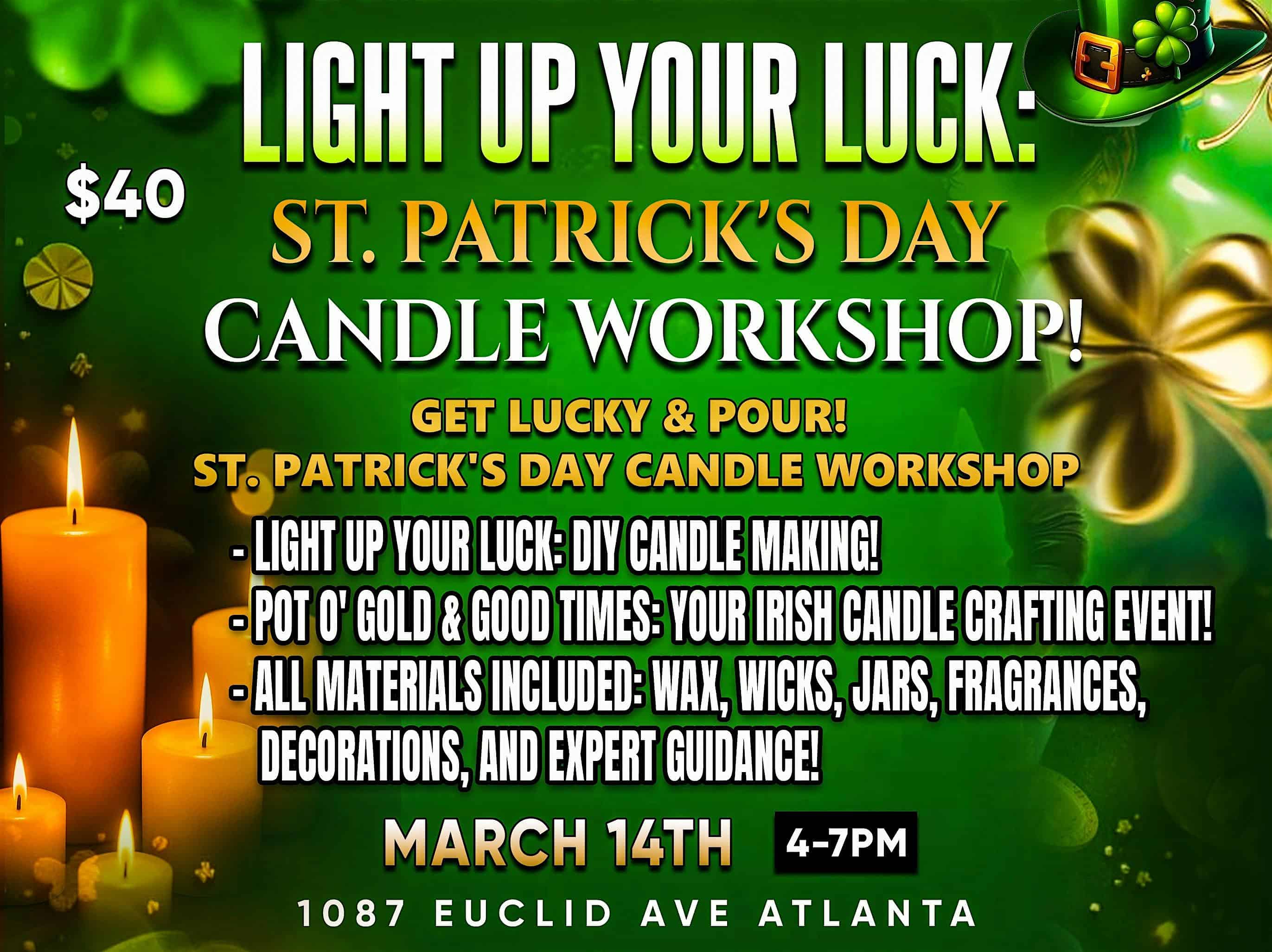 by admin14Feb Light Up Your Luck☘️ at 1087 Euclid Ave NE – Atlanta, GA Light Up Your Luck☘️ at 1087 Euclid Ave NE – Atlanta, GA 2 2 people viewed this event. Looking for a little Irish magic? ✨ Come join us for our St. Patrick’s Day Candle Making Workshop! Think fresh greens, lucky clover Tickets-RSVP Link Date And Time Saturday, March 14th, 2026 08:00 PM (PST) Venue 1087 Euclid Ave NE Location 1087 Euclid Avenue Northeast, Atlanta, GA 30307 Event Types Party or Social GatheringSeasonal & Holiday Event Category AtlantaGeorgia Share With Friends Facebook Twitter Linkedin Xing Pinterest Share This Post: