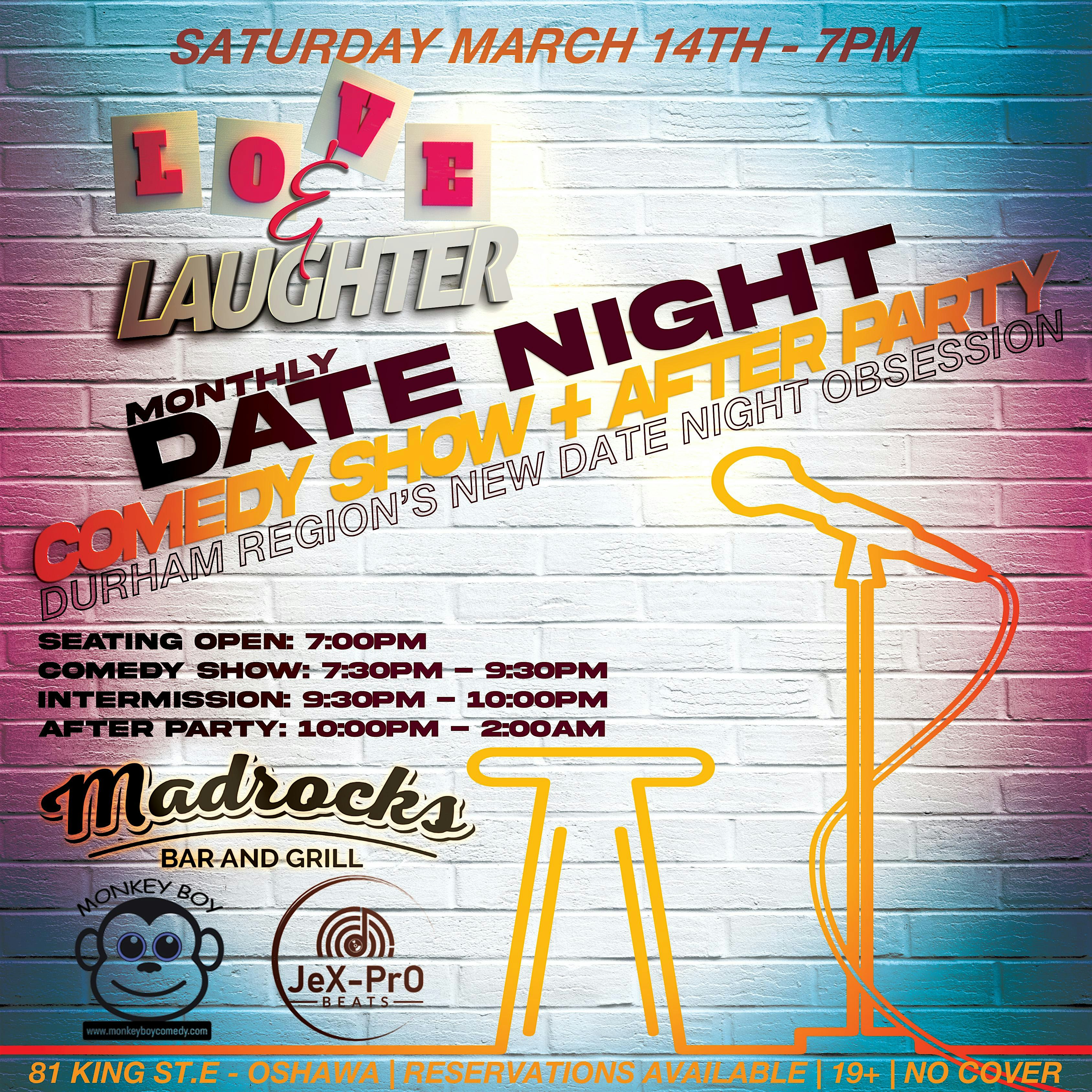 by admin27Feb LOVE & LAUGHTER – Date Night Comedy Show + After Party at MADROCKS BAR & GRILL – Oshawa, Canada LOVE & LAUGHTER – Date Night Comedy Show + After Party at MADROCKS BAR & GRILL – Oshawa, Canada 1 1 people viewed this event. Love & Laughter Date Nigh Comedy Show and After Party! NO COVER! Tickets-RSVP Link Date And Time Saturday, March 14th, 2026 @ 07:00 PM Location 81 King Street East, Oshawa, Canada L1H 1B2 Event Types Party or Social GatheringPerforming & Visual Arts Event Category Canada Share With Friends Facebook Twitter Linkedin Xing Pinterest Share This Post: