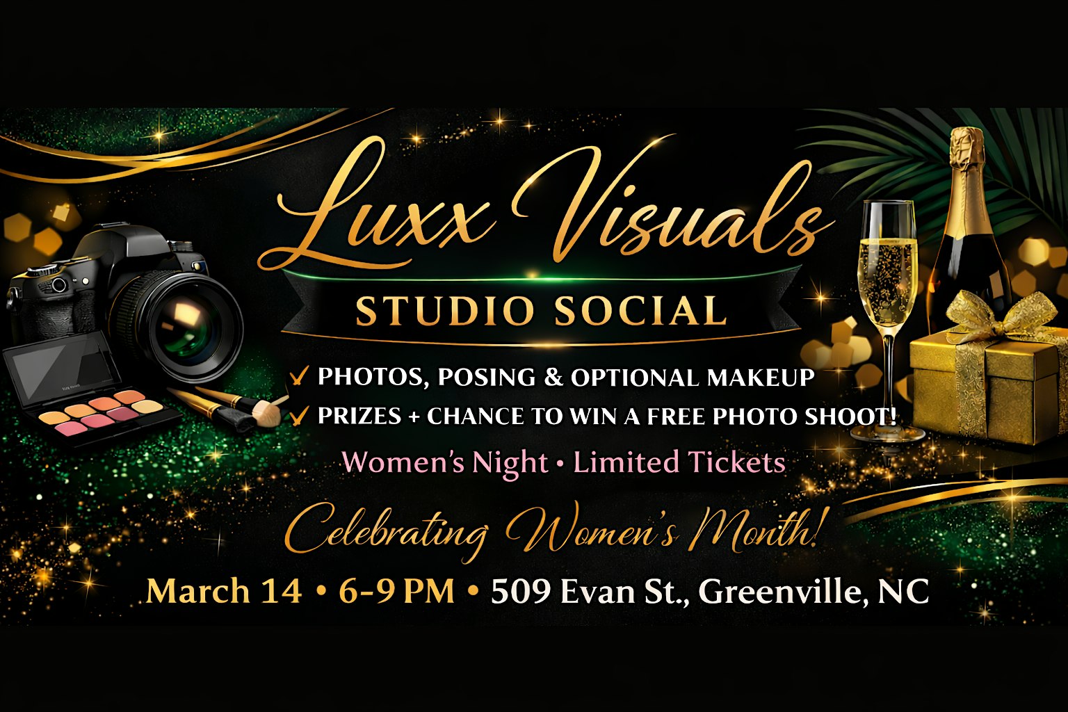 by admin27Feb Luxuree Photography Studio Social Free photoshoots + more at Luxuree Photography – Greenville, NC Luxuree Photography Studio Social Free photoshoots + more at Luxuree Photography – Greenville, NC 1 1 people viewed this event. Come chill at Luxuree Studio for free photoshoots, fun vibes, and more cool surprises! Tickets-RSVP Link Date And Time Saturday, March 14th, 2026 06:00 PM (PST) Venue Luxuree Photography Location 509 Evans Street, Greenville, NC 27858 Event Types Party or Social Gathering Event Category North Carolina Share With Friends Facebook Twitter Linkedin Xing Pinterest Share This Post: